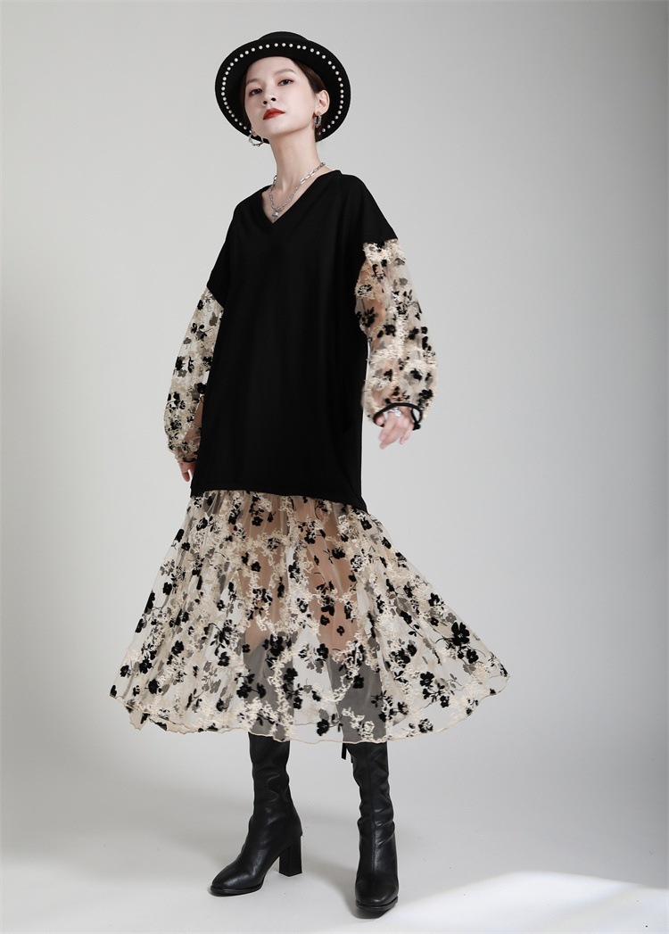 オンリーワントゥーユー激安セール 丸首長袖 ゆったりウエスト 花柄ネットレースワンピース 透け感あるレース素材で肌触り良く スリム効果でお腹や腰を隠す 日常・デート・通勤に適した長裙