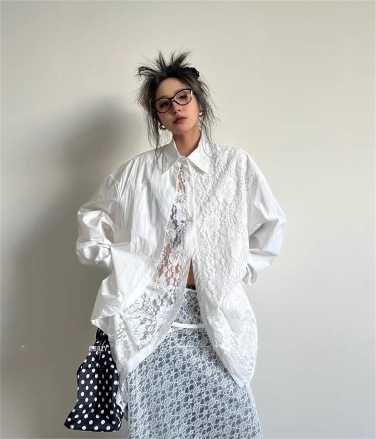 Twinkling star激安セール ホワイトレースパッチワークフェイクツーピーストップス レディーススプリングサマー新着 ポロカラーロングスリーブ ルーズ通気性オフィスカジュアル款