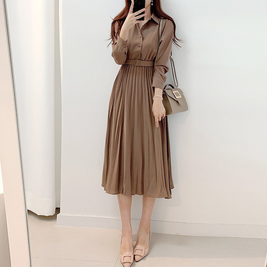 長袖ロング・マキシ丈ワンピ シャツワンピ ミディアム丈 プリーツ Aライン ワンピース・ドレス
