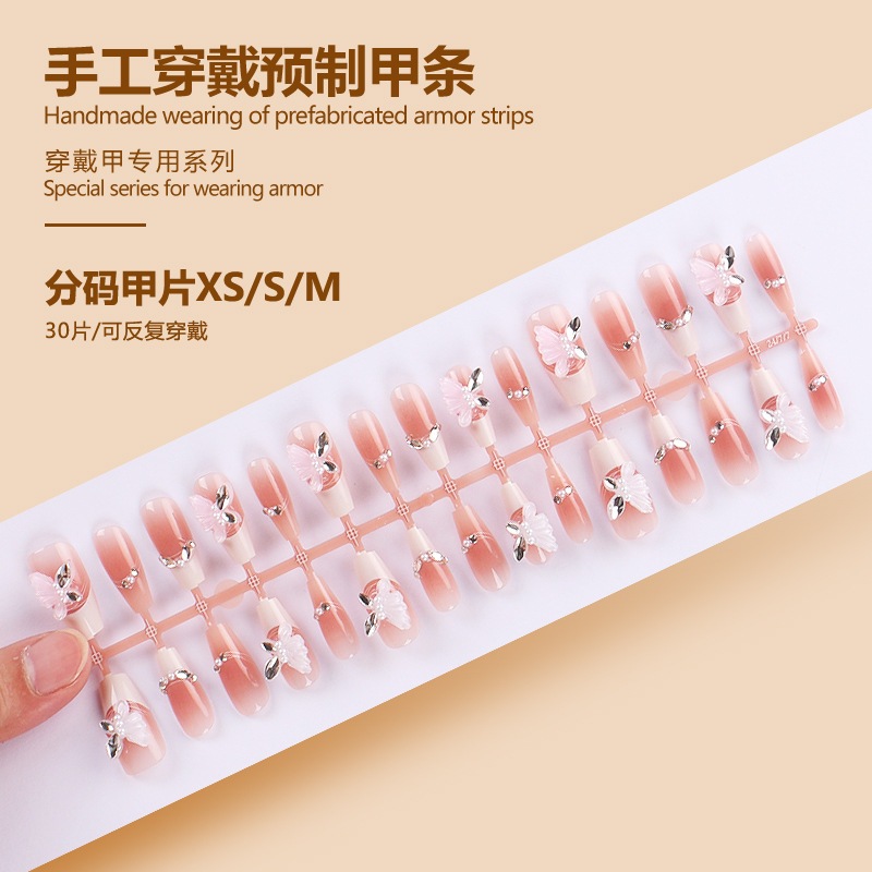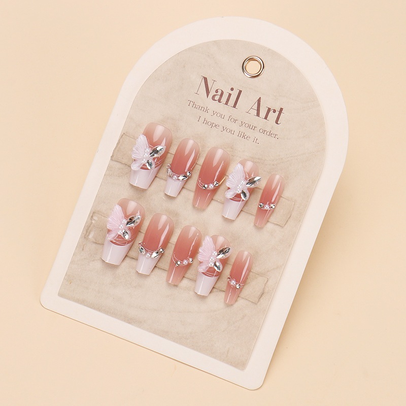 つけ爪ミディアムロング丈ブラッシュカラー高級感夏向け美白効果手作りネイルチップラインストーン蝶フレンチスタイルつけ爪