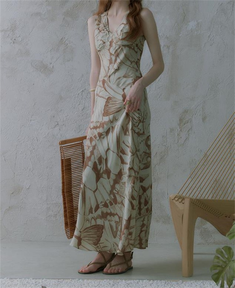 激安セール シェイプアップレトロ蝶柄Vネックノースリーブワンピ ウエストシェイプエレガントロング 通勤もパーティも两用 立体裁断で美ライン