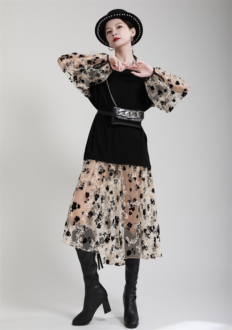 激安セール 丸首長袖 花柄ネットレース ゆったりウエスト スリム長裙 ネットレースの透け感で女性らしさUP ゆったりウエストで食後の膨らみも気にならない 通勤やデートにぴったりのおしゃれワンピース