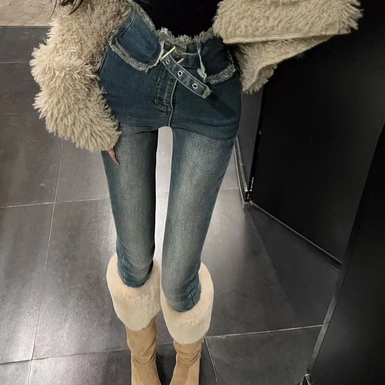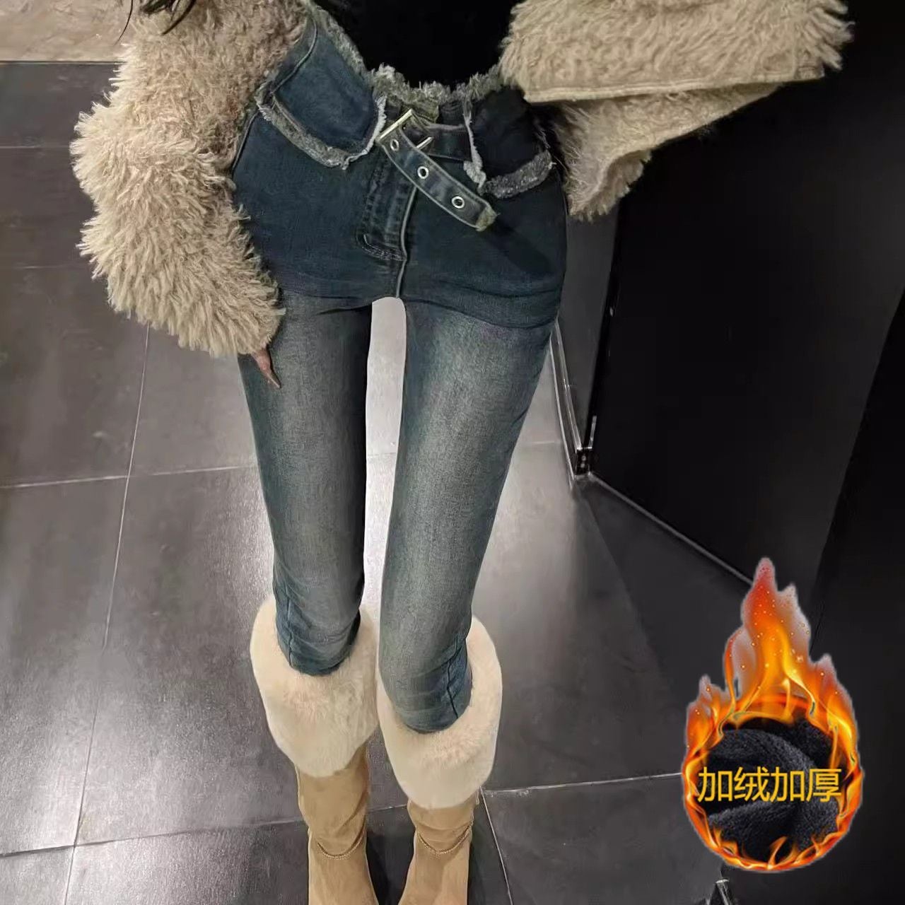 激壳れ レトロおしゃれハイウエストジーンズ女性秋冬裏地付きスリムフィットストレッチ痩せて見えるおしゃれペンシルスキニーブーツカット