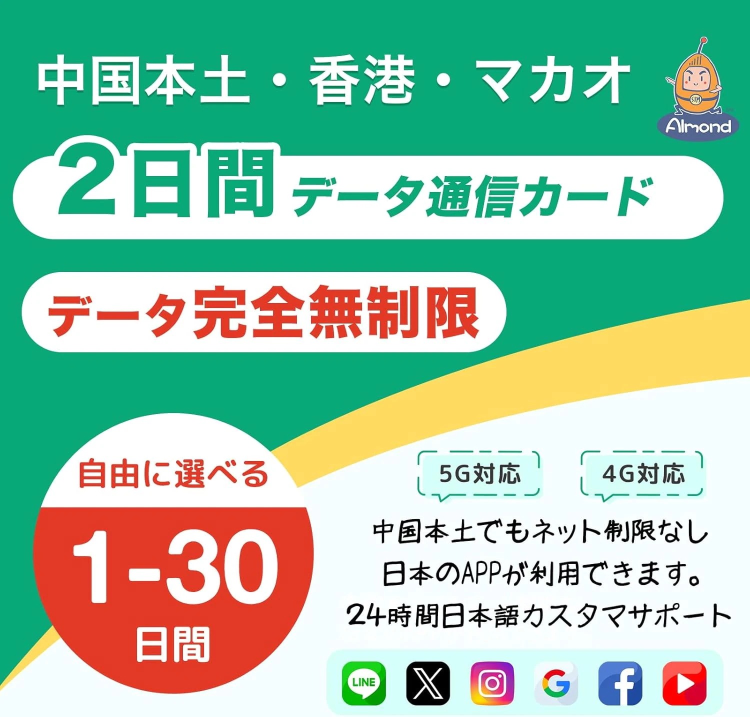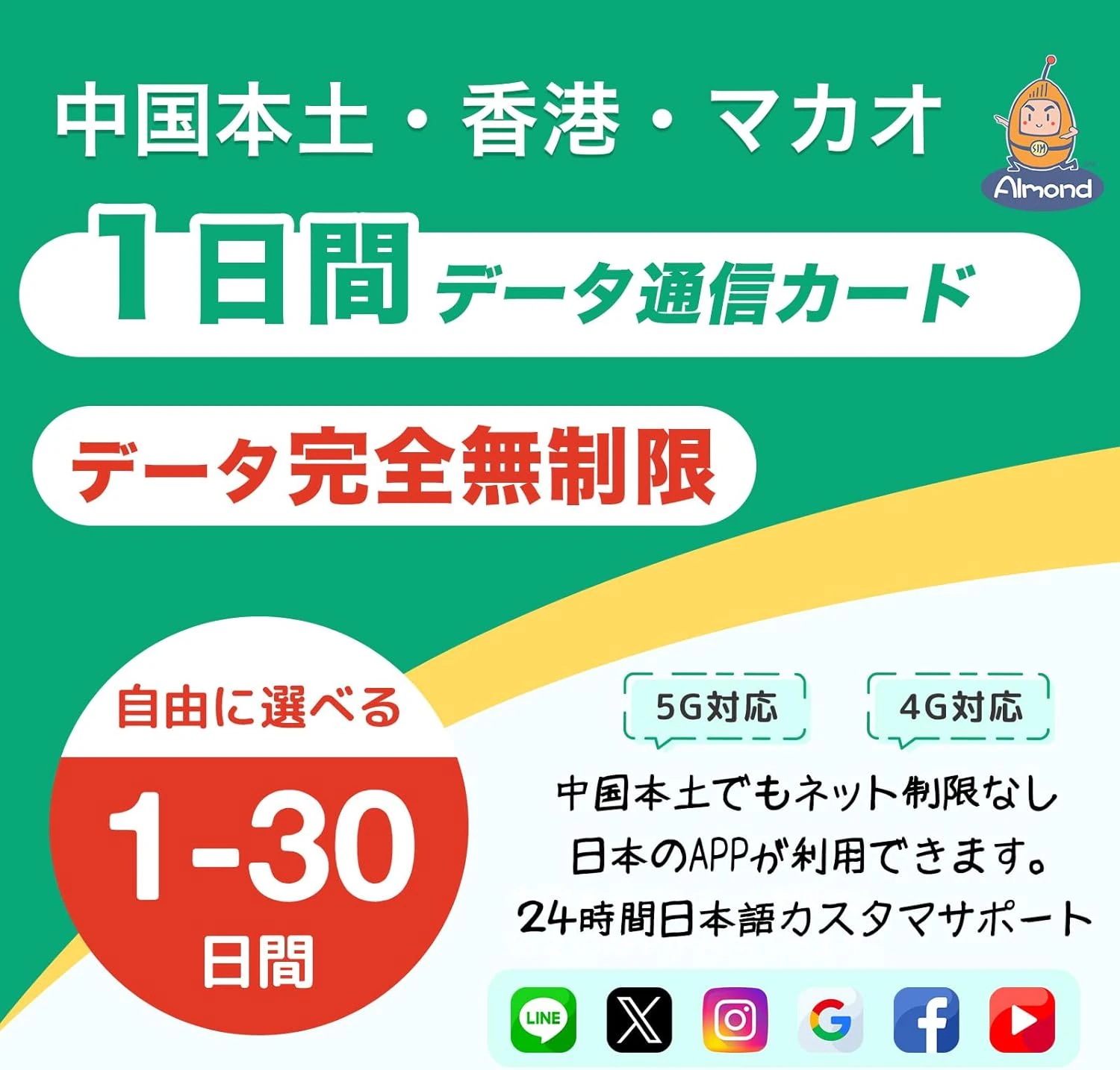 Almond eSIM【Almond SIM】中国本土 simcard 1/2日間 高速データ通信 完全無制限 香港 マカオにも利用可能 1-30日間選択可能 中国ネット規制対象外 中国でもGoogleLINEYouTub
