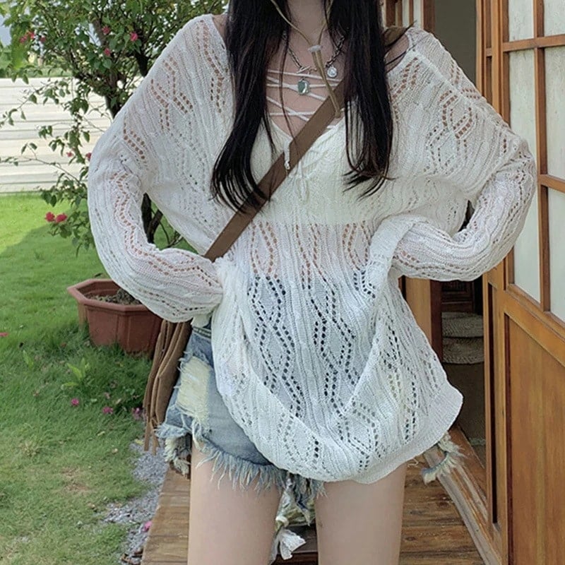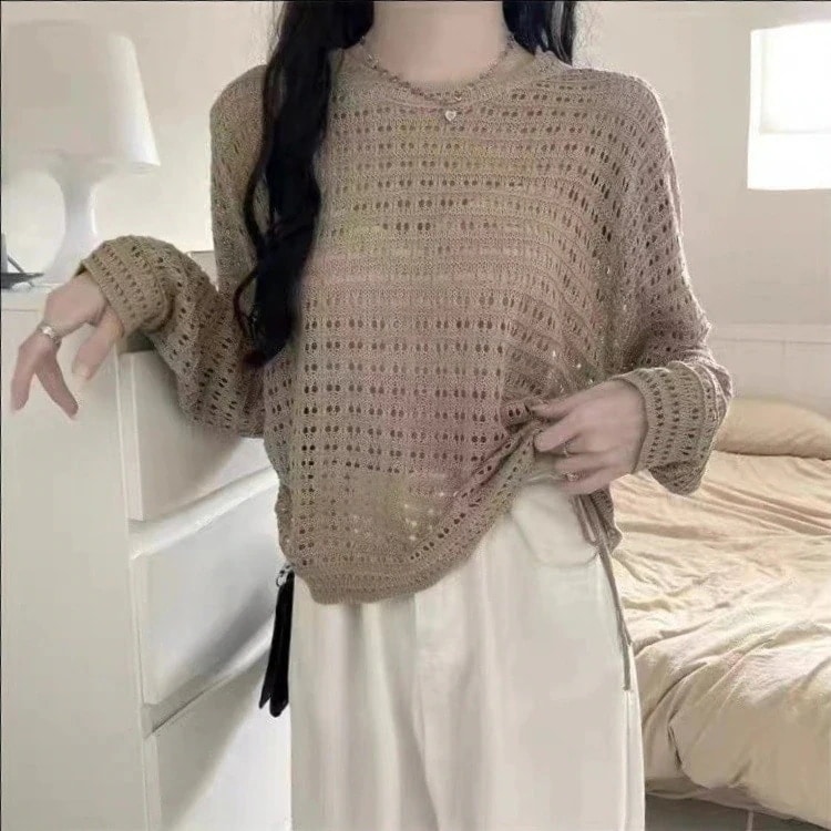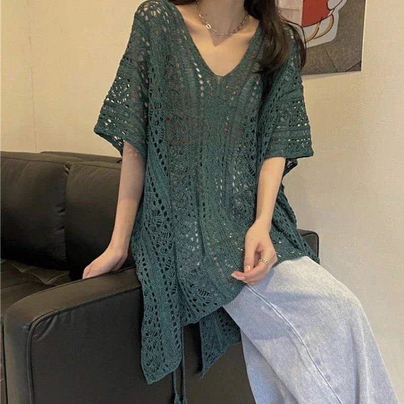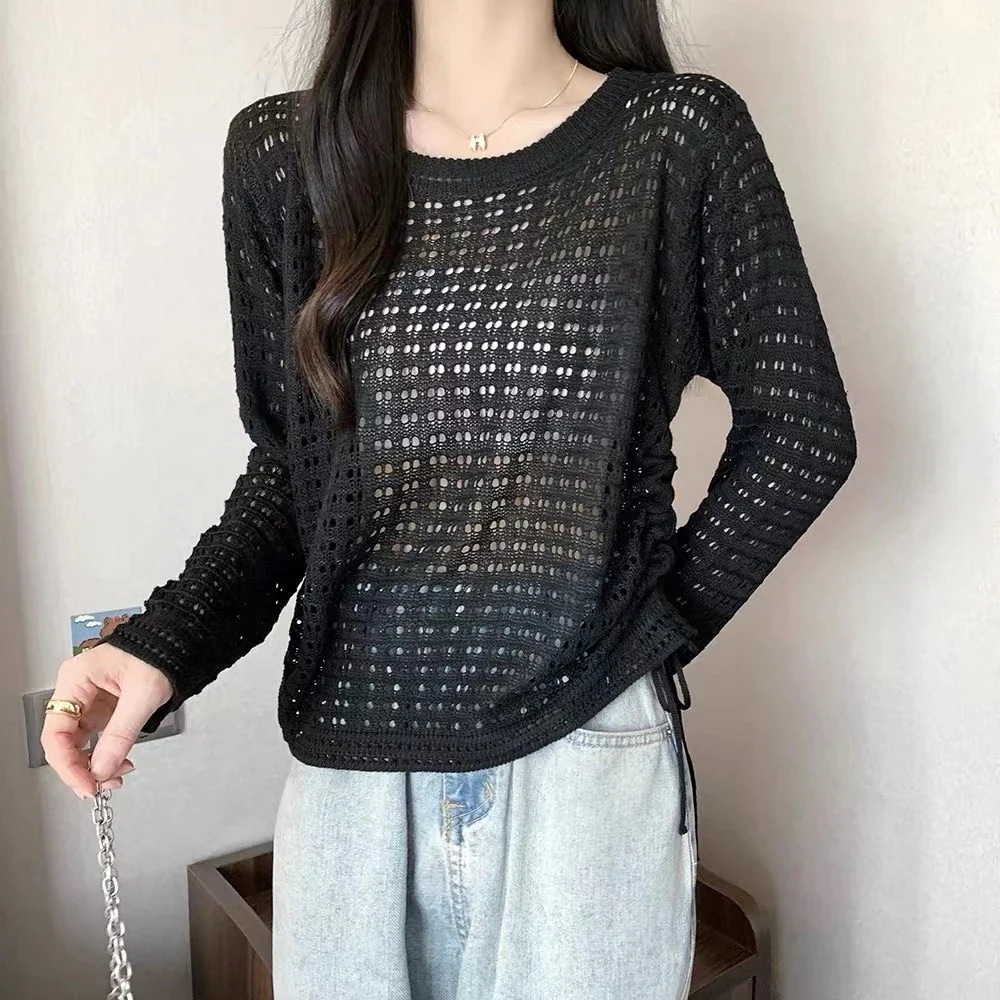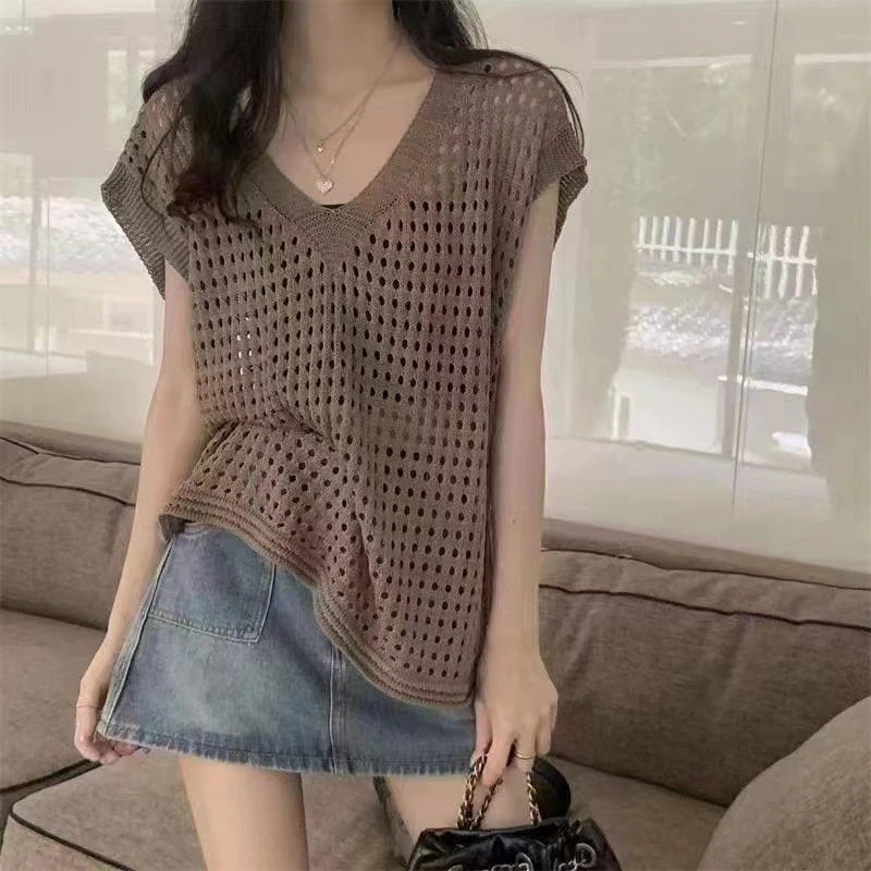 2025 夏新作 レディース 透かし編みニット 中空レースアップニットトップス 中空Vネックニットセーター 女性 夏 デザイン ゆったり ダラダラ 薄手 トップス