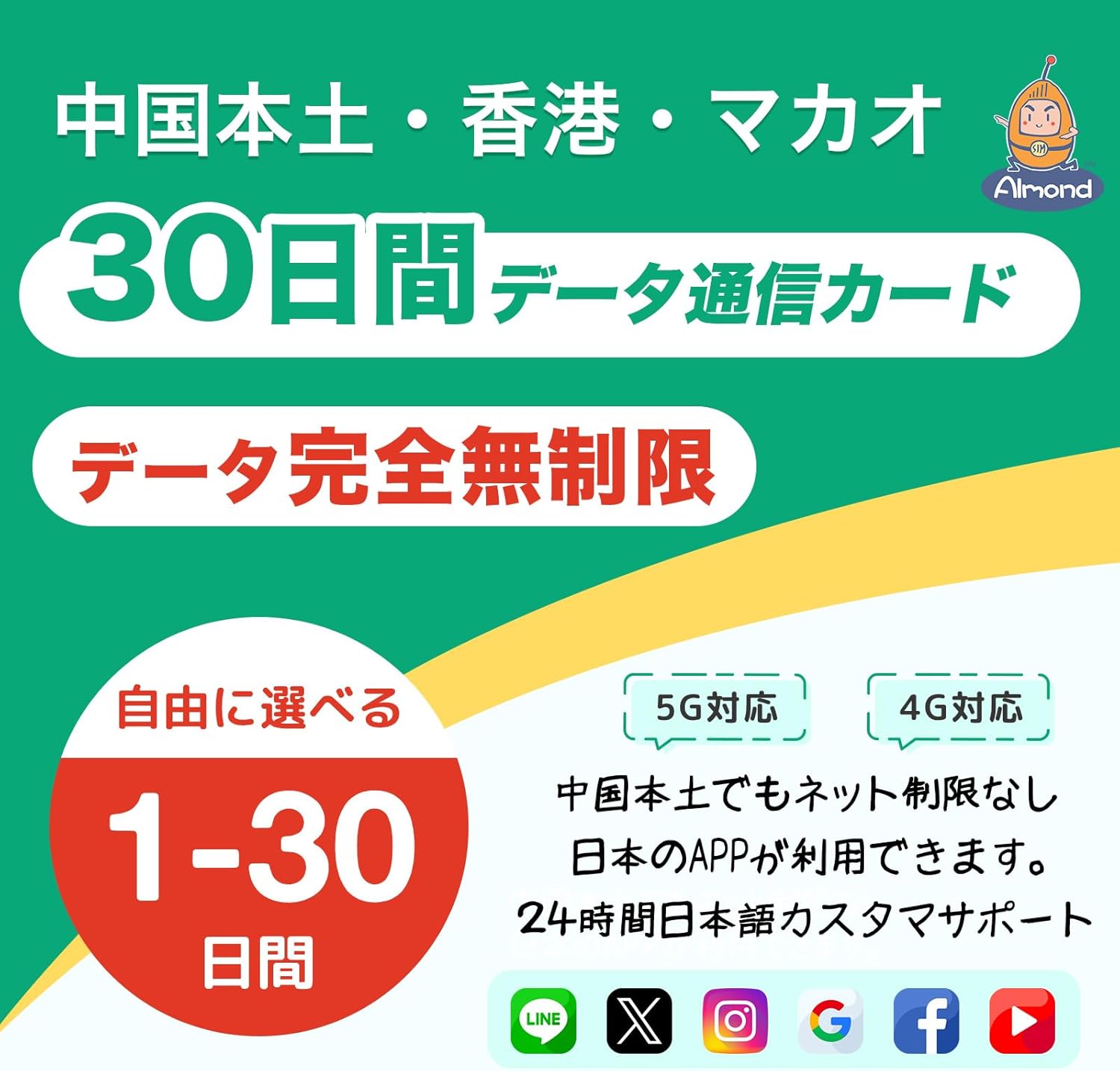 Almond eSIM【Almond SIM】中国本土 simcard 15/20/30日間 高速データ通信 完全無制限 香港 マカオにも利用可能1-30日間選択可能 中国ネット規制対象外