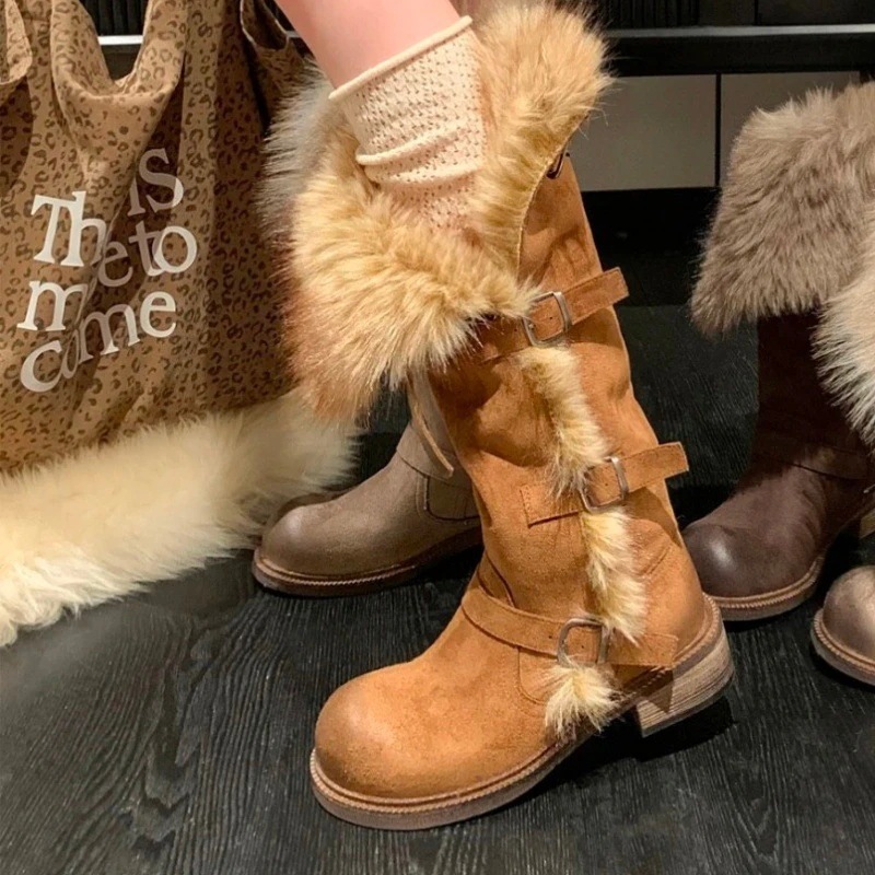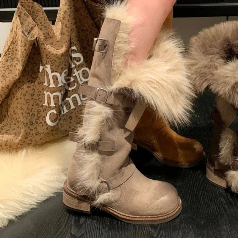トレンド2ウェイ 厚手保温コットンブーツ 女性用 2025年新作 ベルトバックル付き フリース裏地付きロングスノーブーツ ロングブーツ トレンド