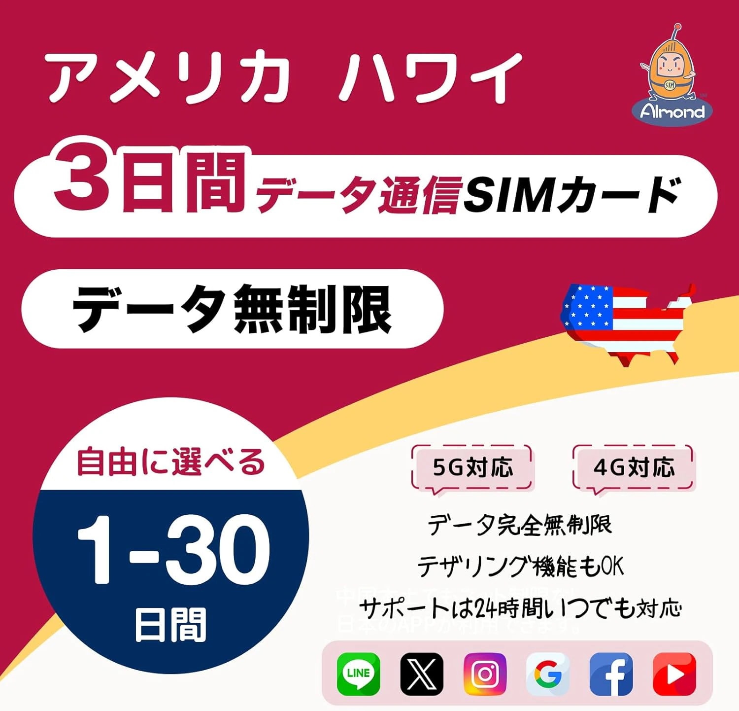 Almond eSIM【Almond SIM】アメリカ ハワイ 1/3日間 完全データ無制限 5G 4G-LTE 高速通信 使い放題即時利用可・当日開通 プリペイドSIM24時間多言語サポート