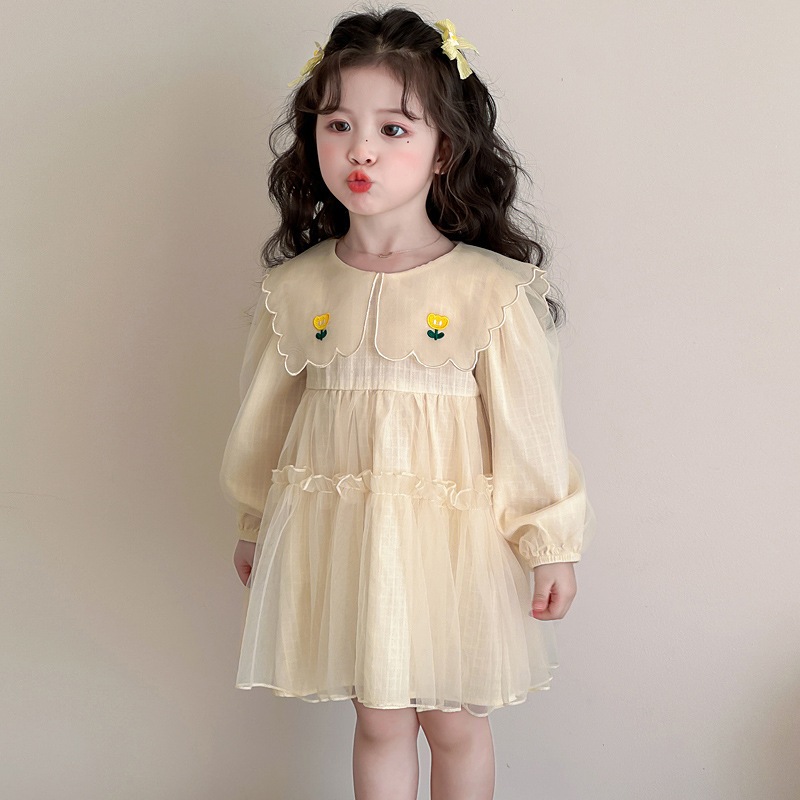 女の子用ドールカラーワンピース 春の新作 長袖メッシュ おしゃれなベビースプリングプリンセスドレス