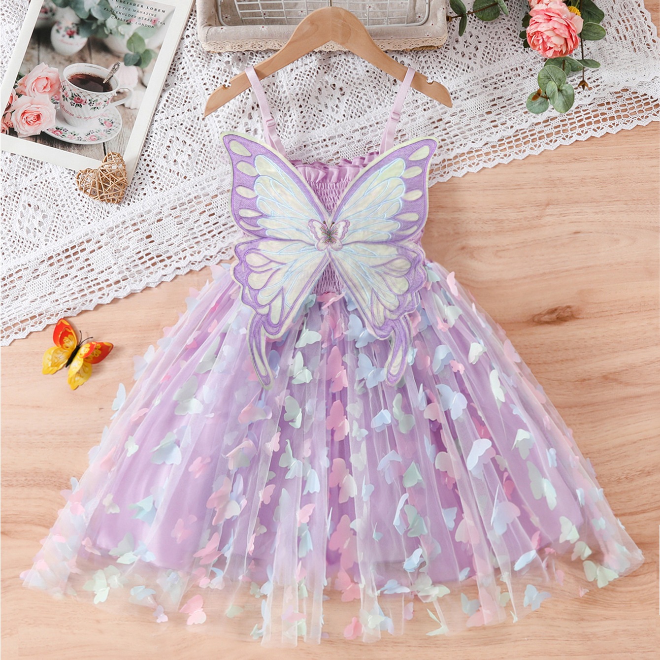 純綿製女児用カラフル蝶柄ワンピース夏用おしゃれメッシュスカートベビープリンセスドレス