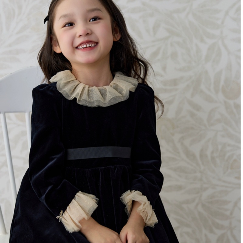 女の子用秋冬ワンピース ブラックベルベット長袖メッシュフリルネックドレス