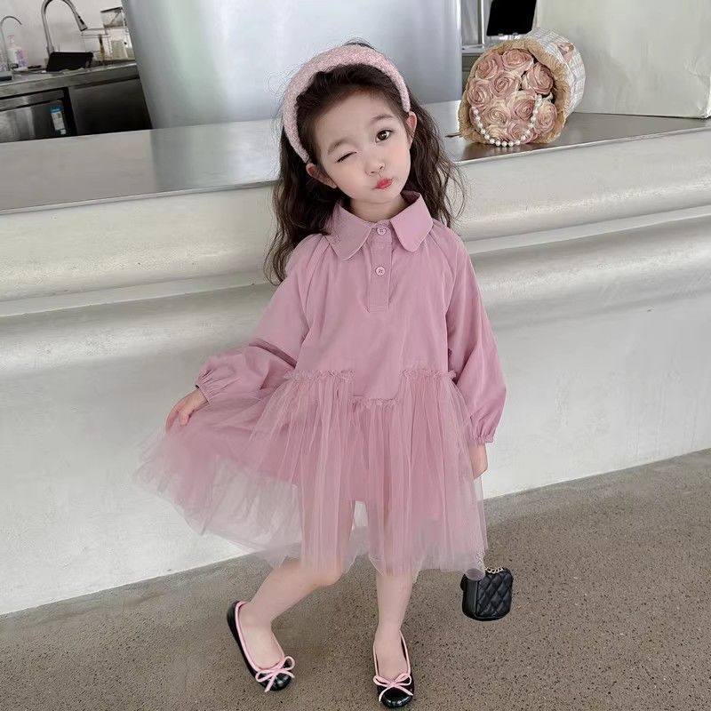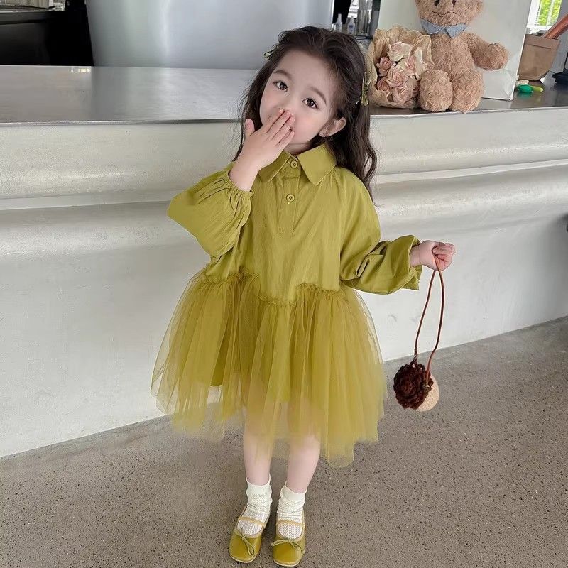 女の子用シャツワンピース 春秋新作 長袖メッシュスカート 薄手でおしゃれなベビーガールプリンセスドレス