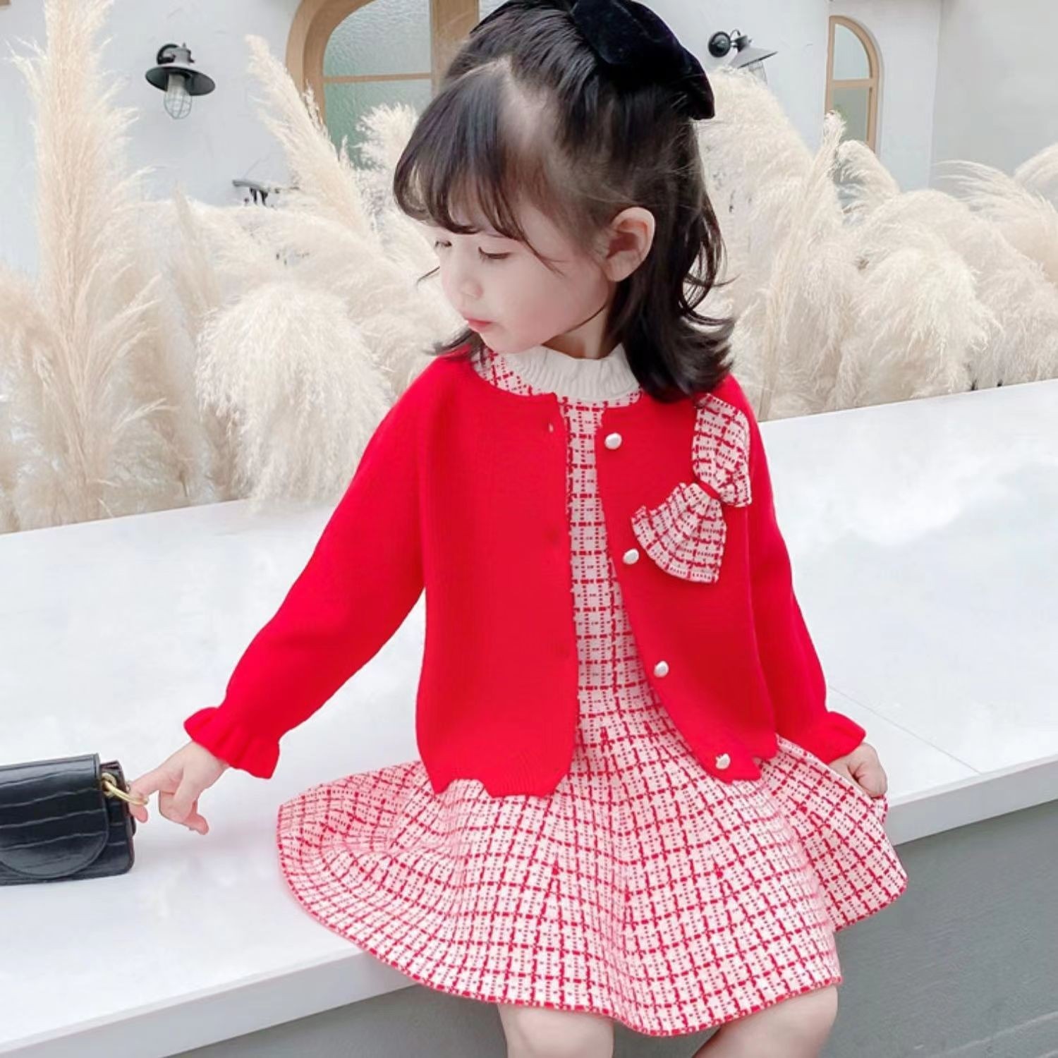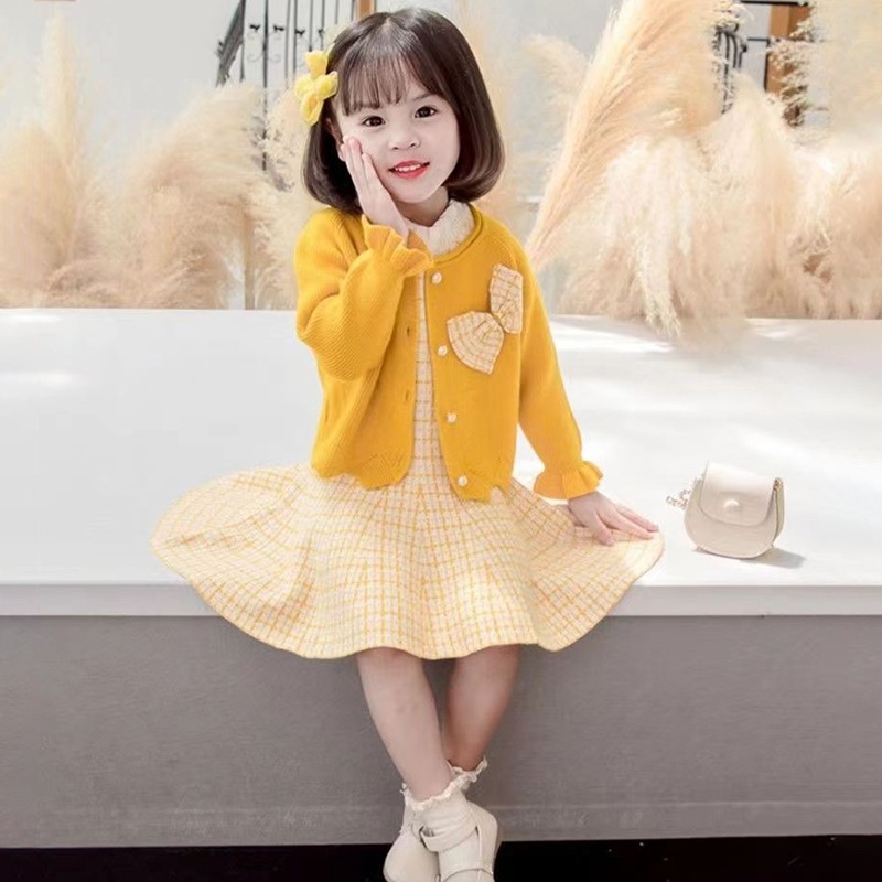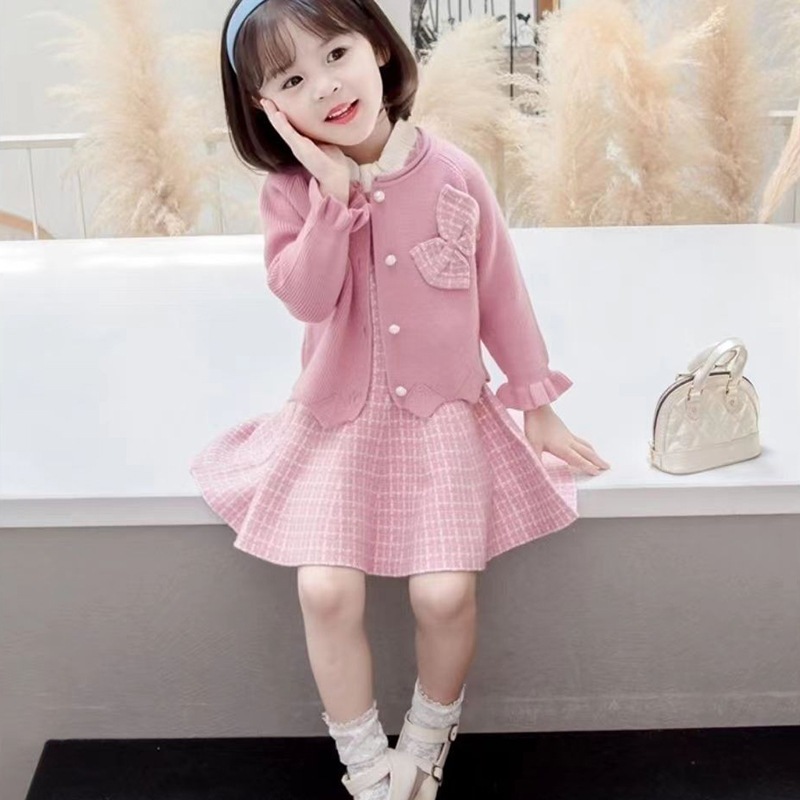 新作子供服女の子用ワンピースセットリボン付きジャカードカーディガンスカートプリンセスドレス