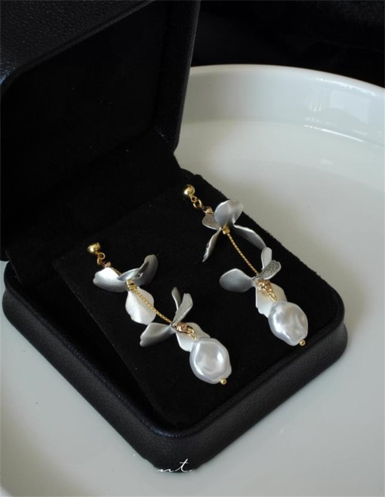 激安セール 夏のアイリスと淡水パールのイヤリング ヴィンテージ風耳夹でエレガントに
