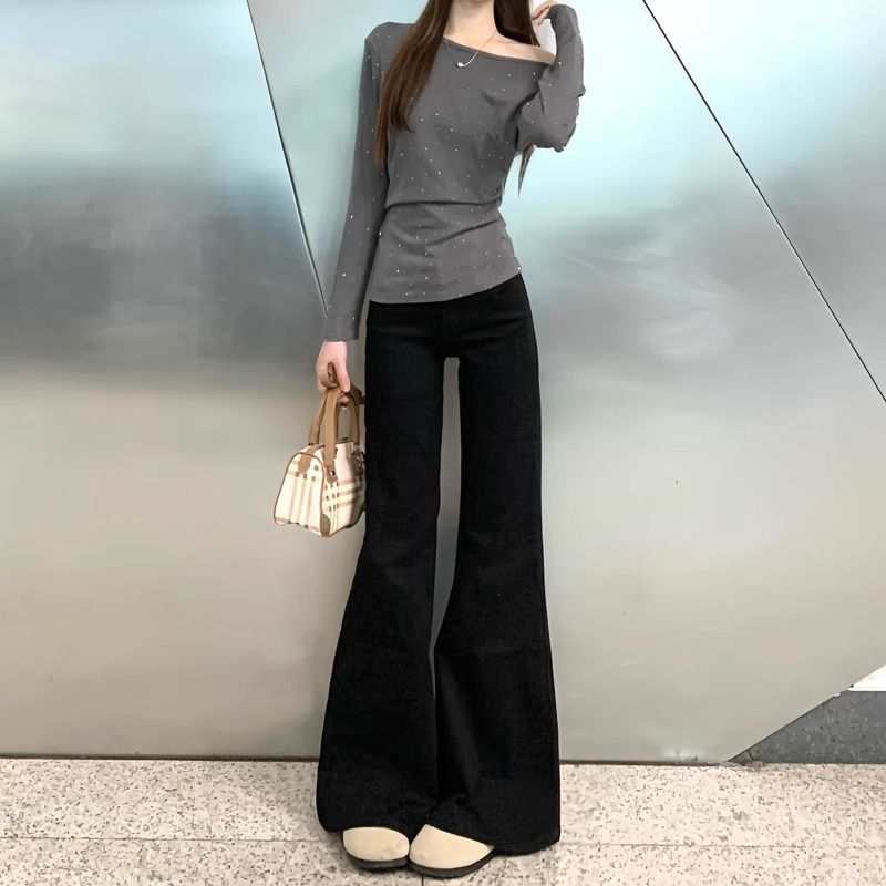 バギースキニー スキニージーンズ カジュアルデニム 通勤ジーンズ 春服ジーンズ 十三行ブラックハイウエストマイクロフレアデニムパンツ女性用春節新作裏起毛スリムフィットストレッチフレアパンツ