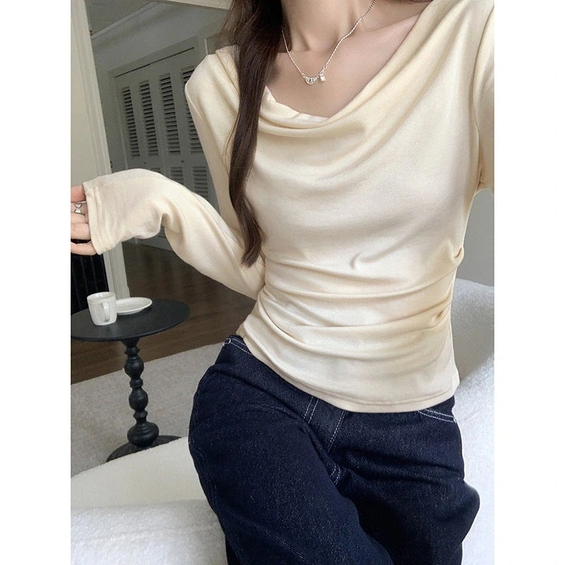 オフショルダー斜め肩オフショルダートップス新作プリーツインナーロングスリーブTシャツ