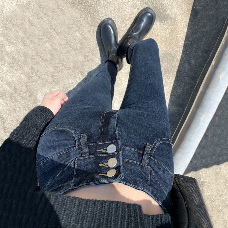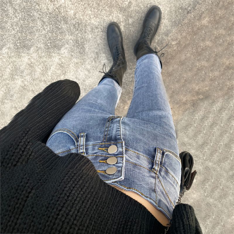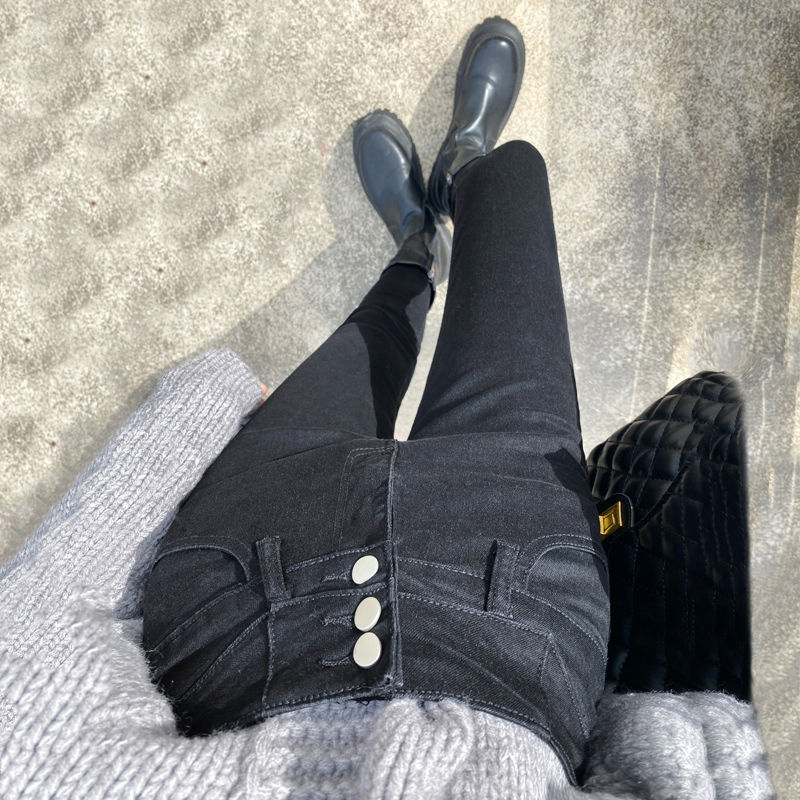 Qoo10限定黒とグレーのハイウエストジーンズ女性春と秋の新しい薄いズボン