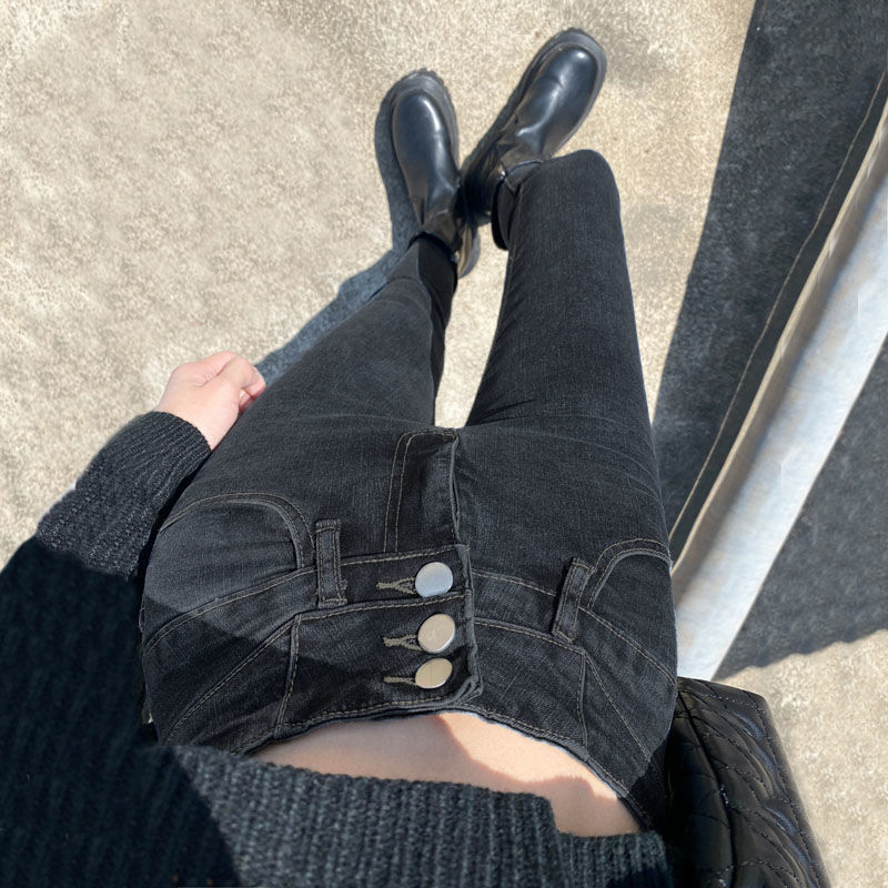 黒とグレーのハイウエストジーンズ女性春と秋の新しい薄いズボン