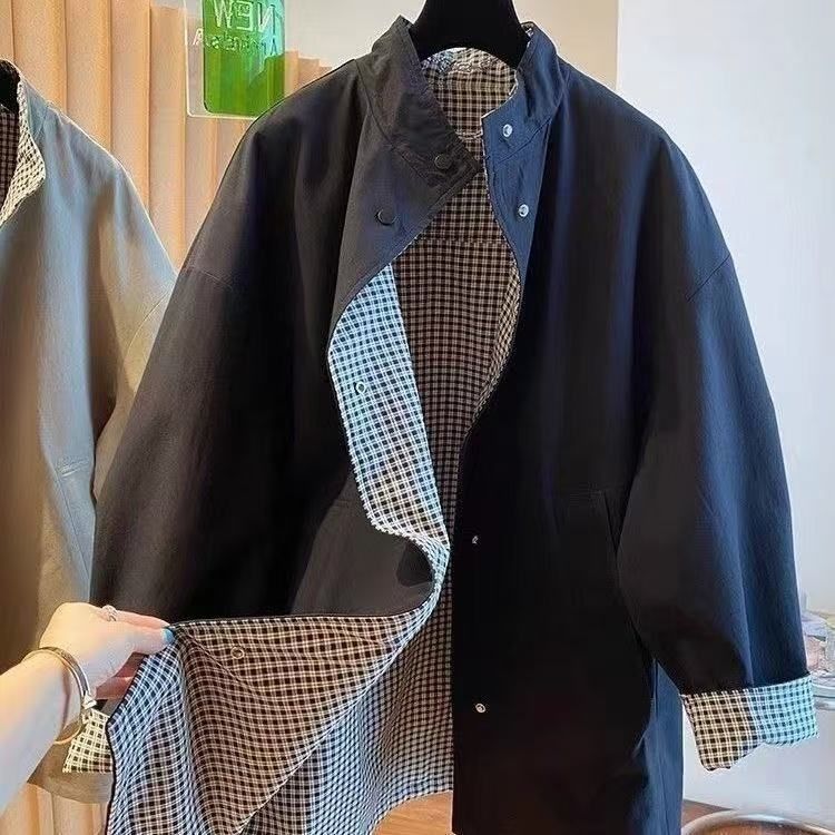 オーバーサイズの韓国系ファッションチェックのリバーシブルトレンチコートレディース春秋新作ミディアムカジュアルスタンドカラートップスレディース