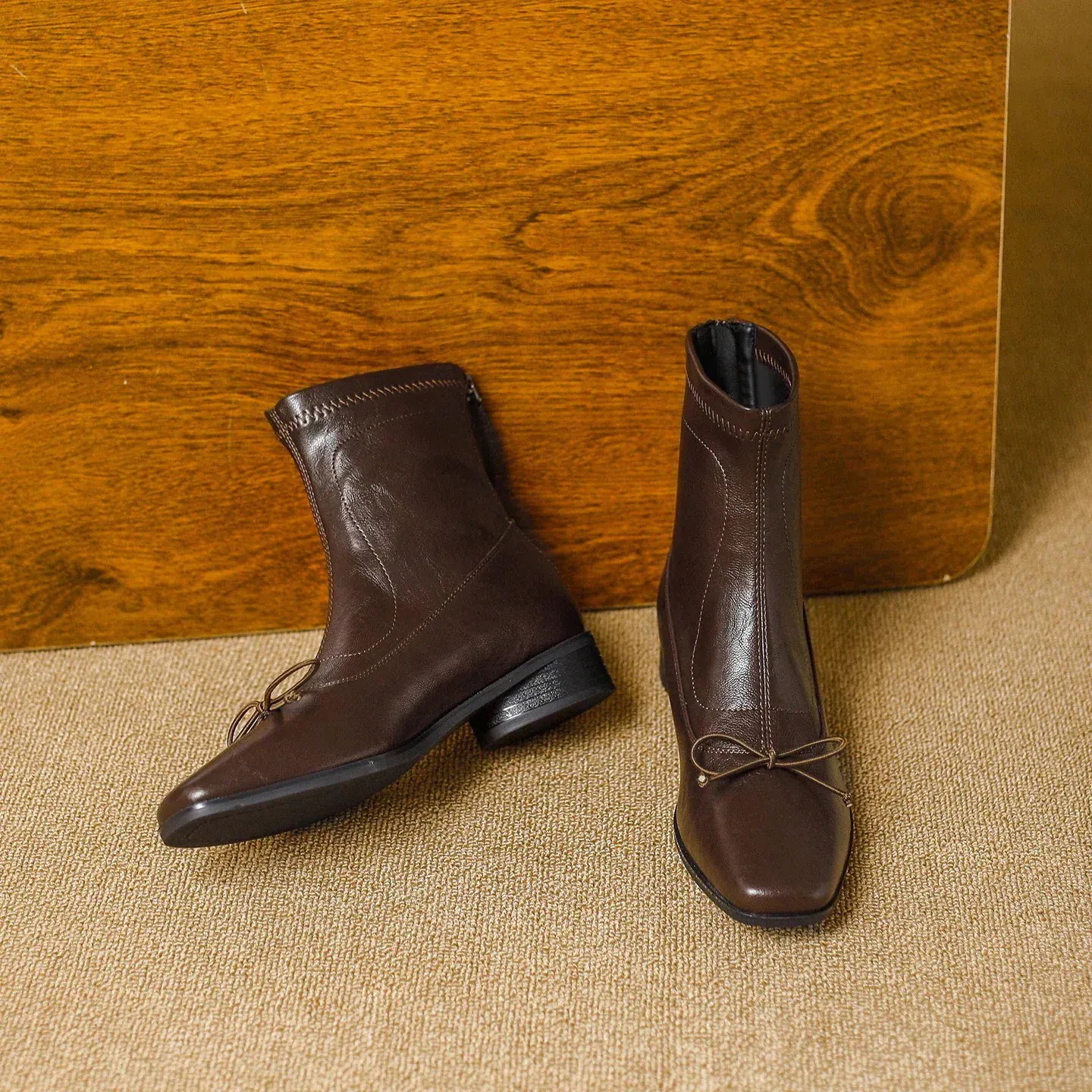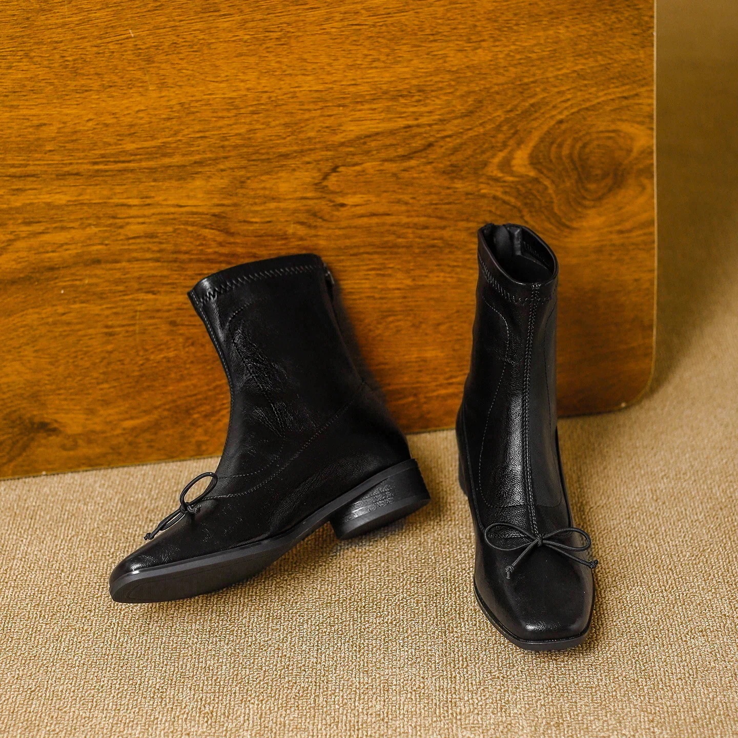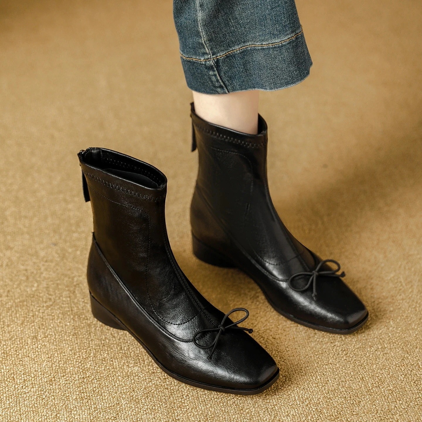 【最安値に挑戦】2026新作 レディース ブーツ 新作 ショートブーツ レディース ニッチ デザイン性 バックジッパー 万能 スクエアトゥ ローヒール ミッドカット ストレッチ素材 スリムブーツ 韓国