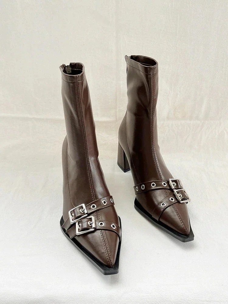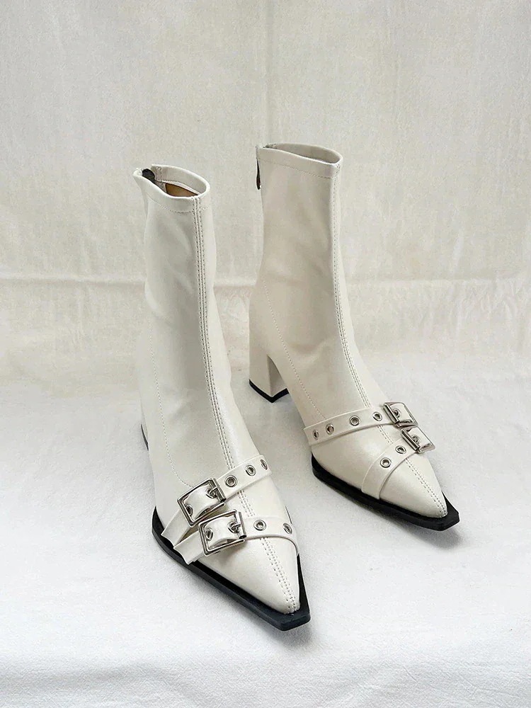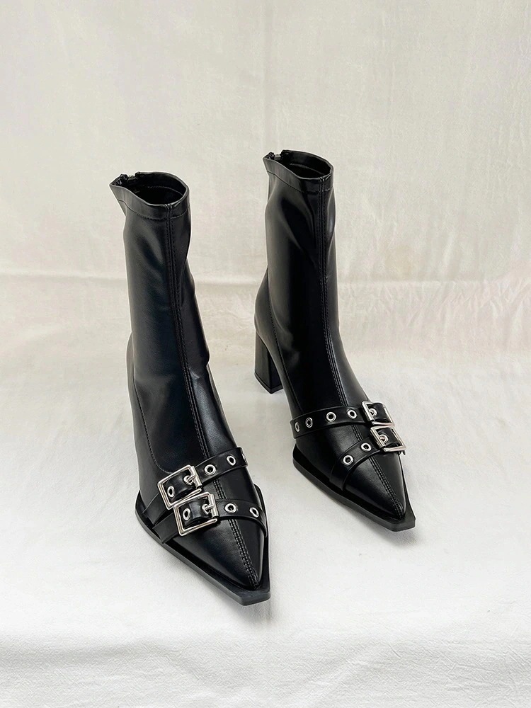 【最安値に挑戦】2026新作 レディース ブーツ 尖ったつま先 ベルトバックル 太いヒール ショートブーツ レディース 欧米風 ハイヒール 後ろファスナー 柔らかい革 スリム効果 ショートブーツ 韓国