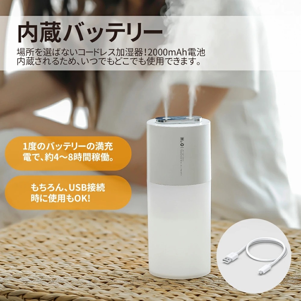 DILLER加湿器 コードレス 超音波 卓上 車載 小型 大容量 双口 噴霧 加湿器 充電式車載 オフィス USB おしゃれ かわいい コンパクト 除菌 静音 卓上加湿器 LEDライト リビング 空気清浄