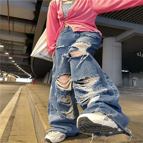 8月追加大人気レディー ハイウエスト ゆったり ストレートパンツ ワイドパンツ 大きいサイズ ダメージジーンズ