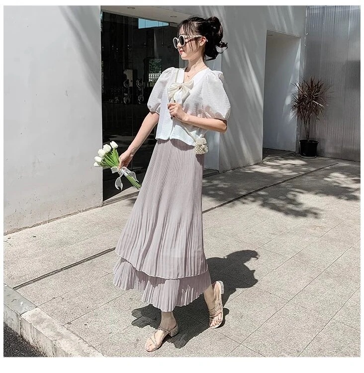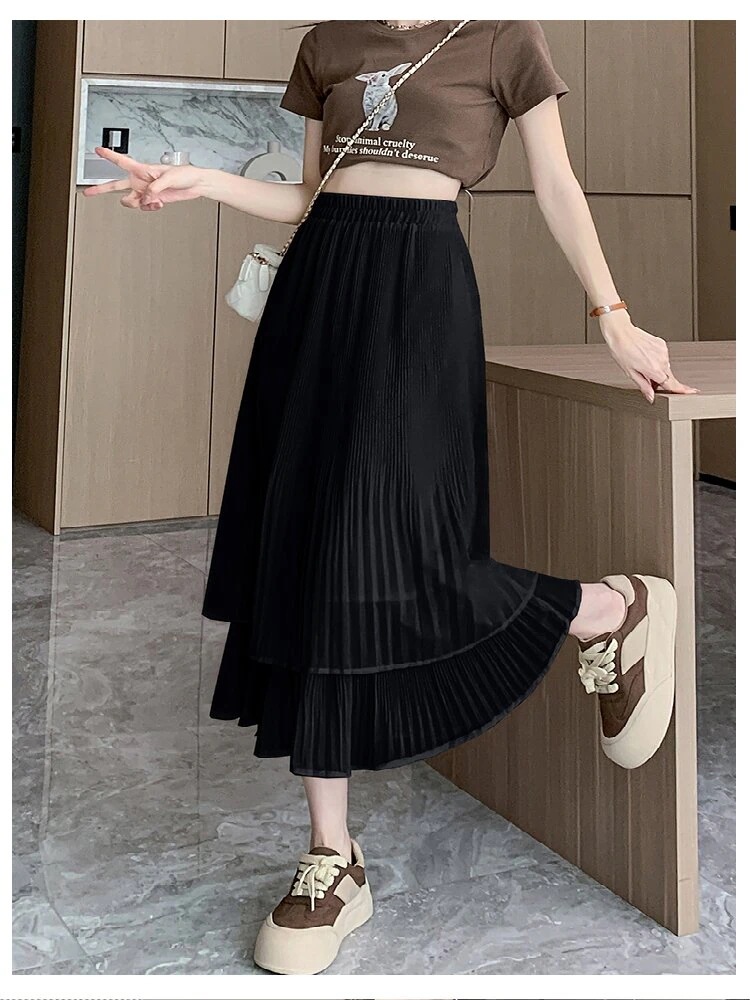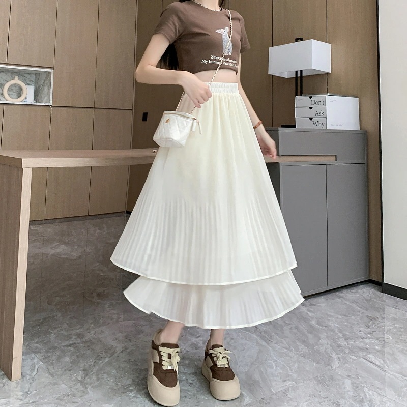 プリーツスカート レディース ロングスカート ティアードスカート サテンスカート ゴムウエスト ミディアム丈 体型カバー 可愛い ファッション カジュアル 快適 旅行 キャンプ女子