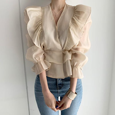 レディース シフォン Vネック フリール ブラウス きれいめ 春夏