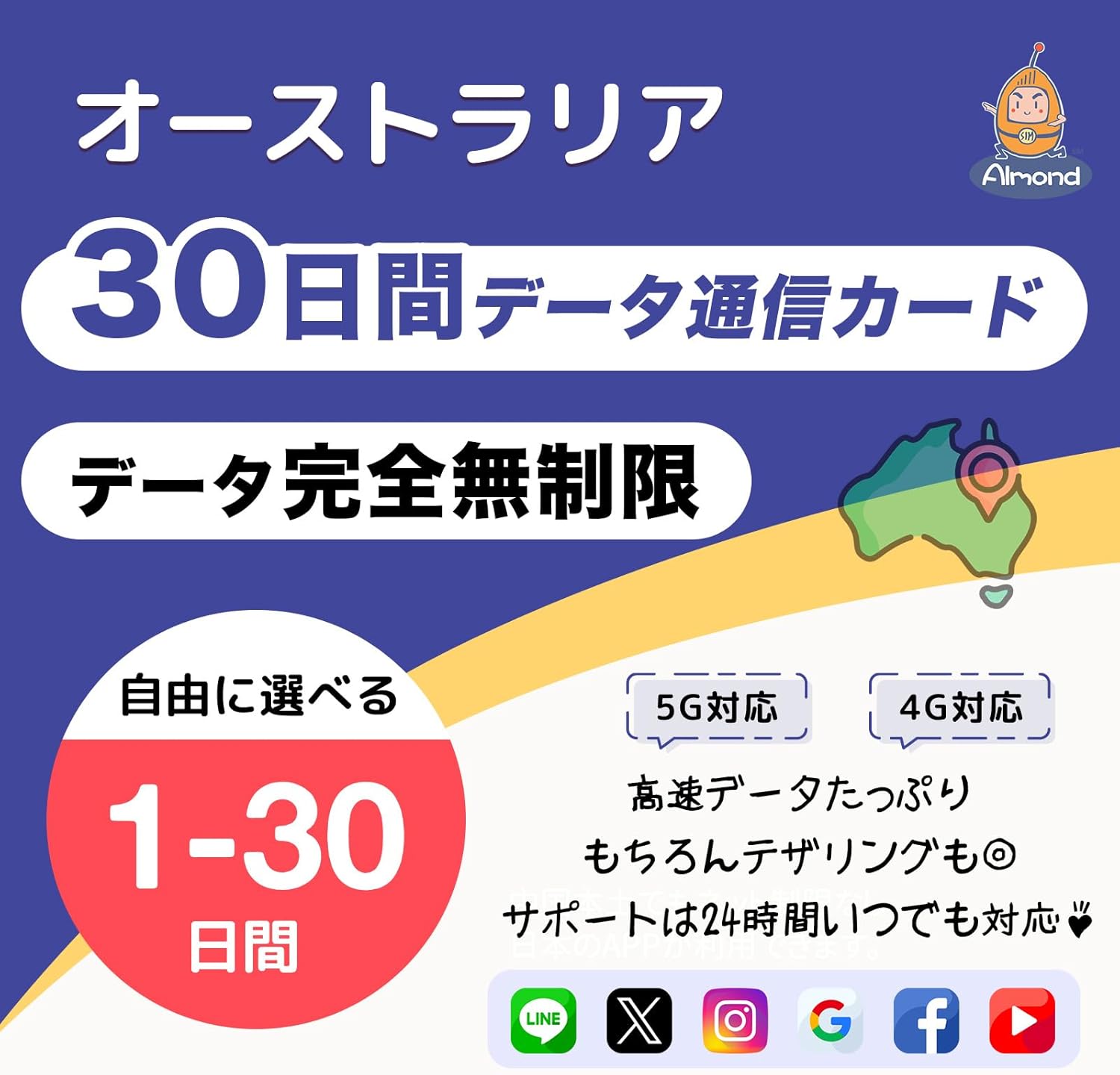 Almond eSIM【Almond SIM】オーストラリア プリペイドSIMカード 20/30日間 データ無制限 5G/4G対応 高速通信 使い放題 Australia simcard 24時間多言語サポート