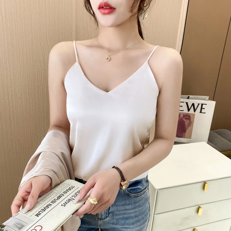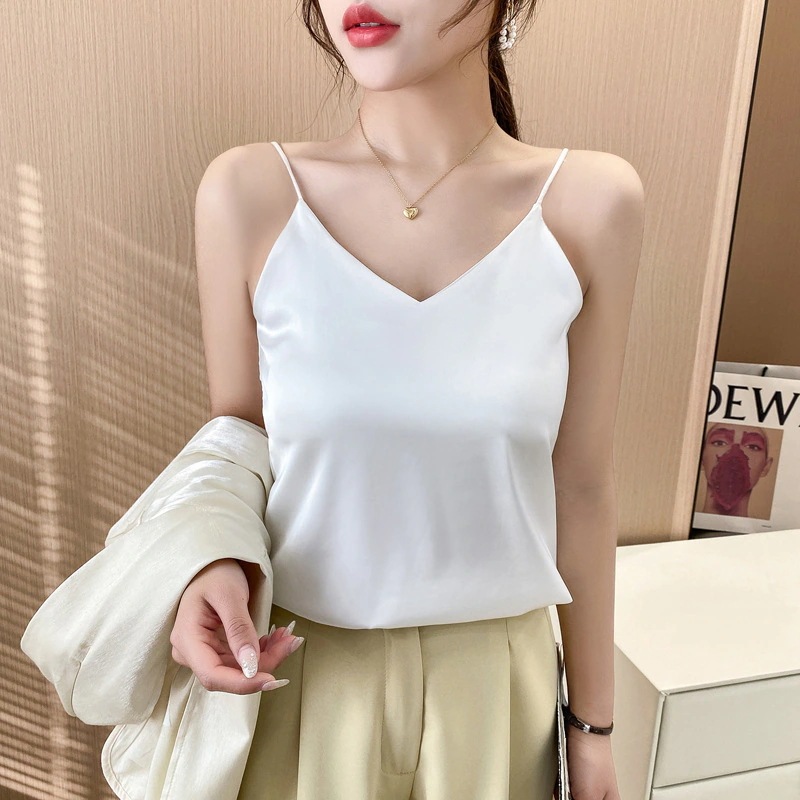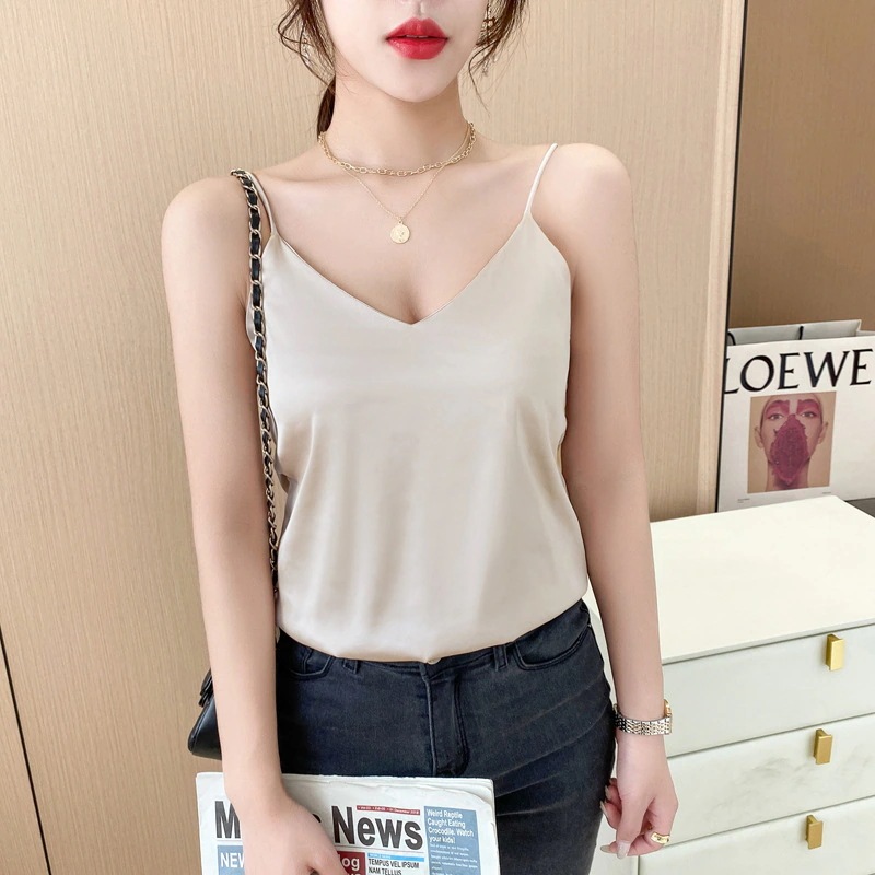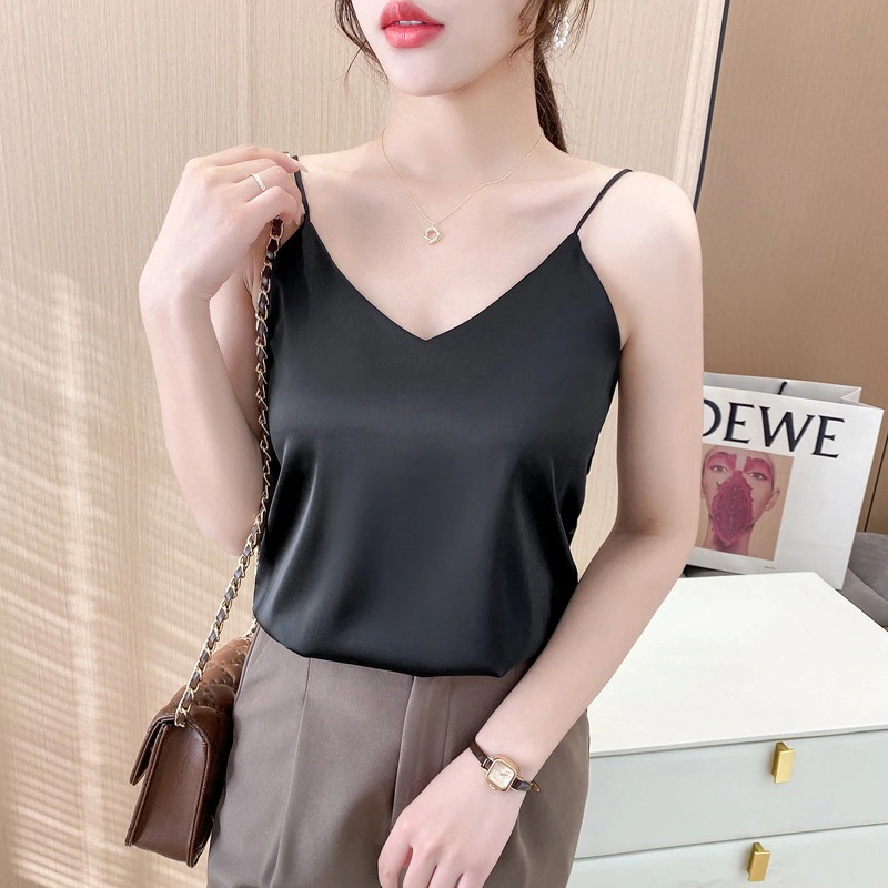 レディース ストラップトップ 夏用 Vネック ジャケット インナー用 シルクサテン シルク製 レディース ストラップトップ