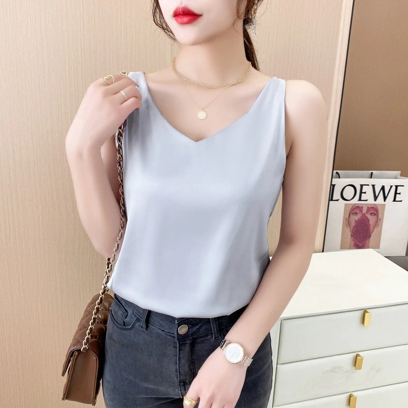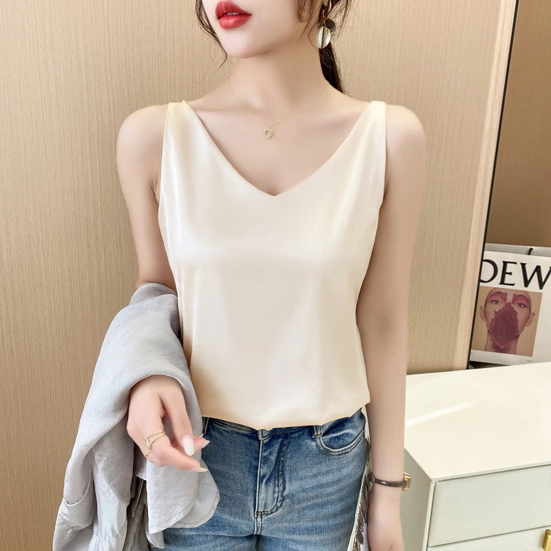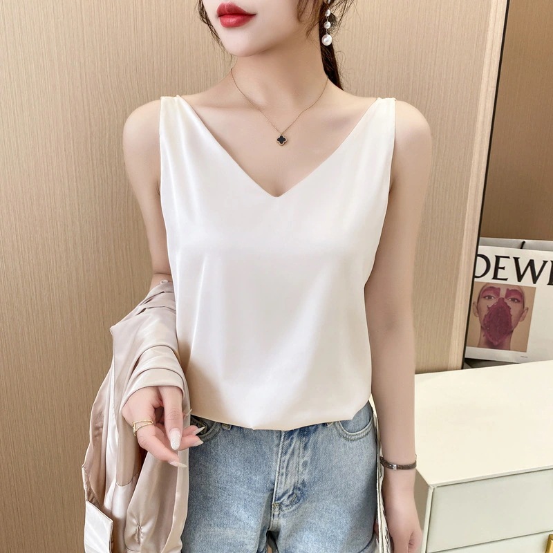 レディース 夏用 Vネック シルクキャミソール(スーツの下に着るまたは単品で着用可能) ホワイト サテン シルク キャミソール