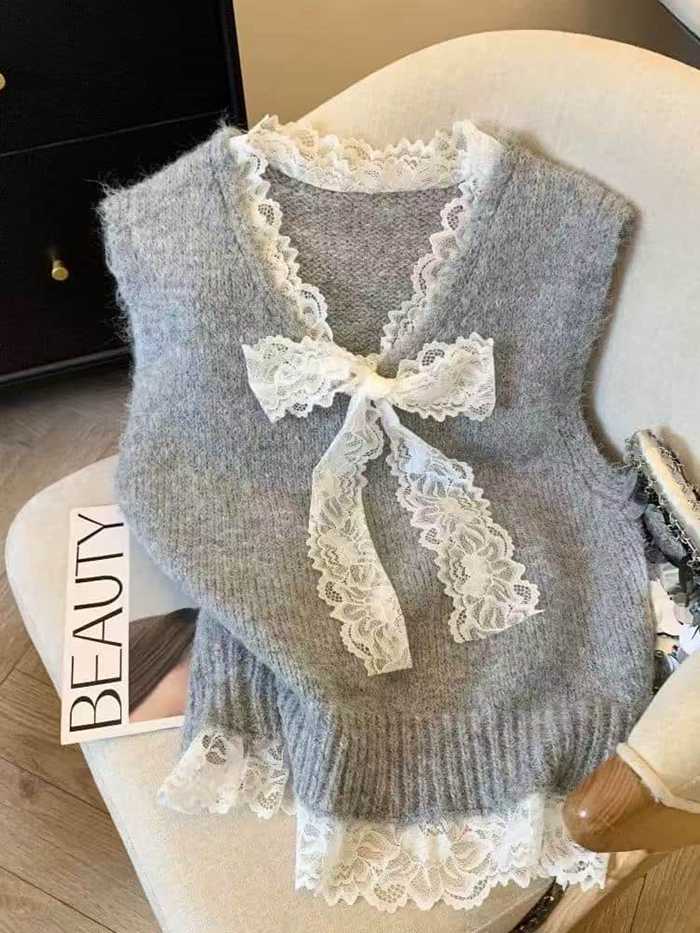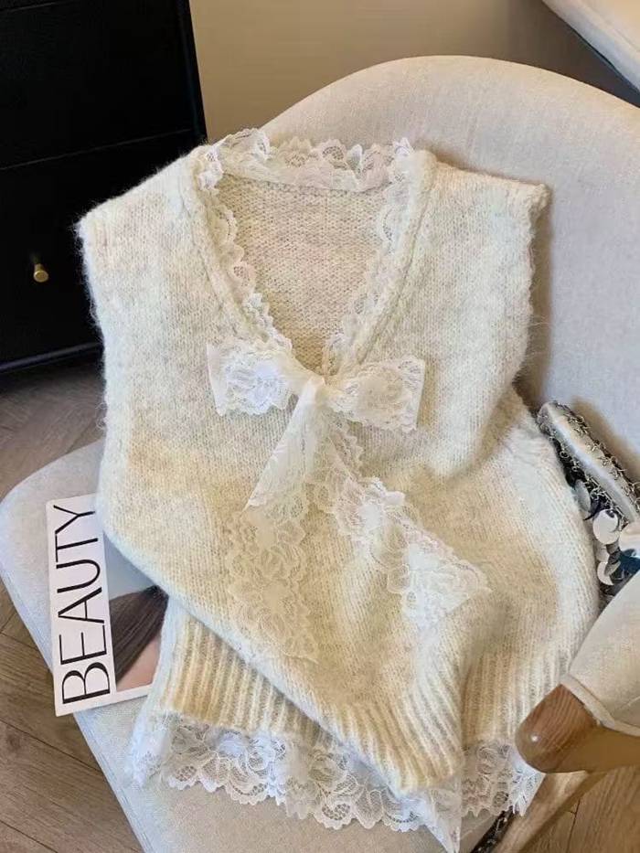 ニットベスト レディース 春 秋 冬 トップス ノースリーブ クルーネック レースニット リボン付き レースベスト オフィス