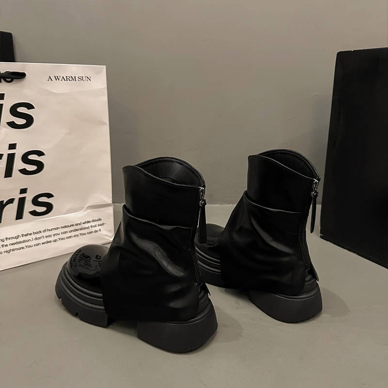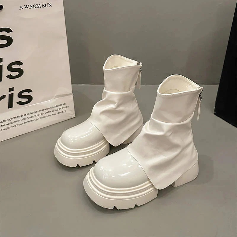 2025年新作 秋用 ホワイト 女性用 低身長向け厚底ヒール ヴィンテージ風ワイドレッグブーツ ブリティッシュスタイル ショートブーツ
