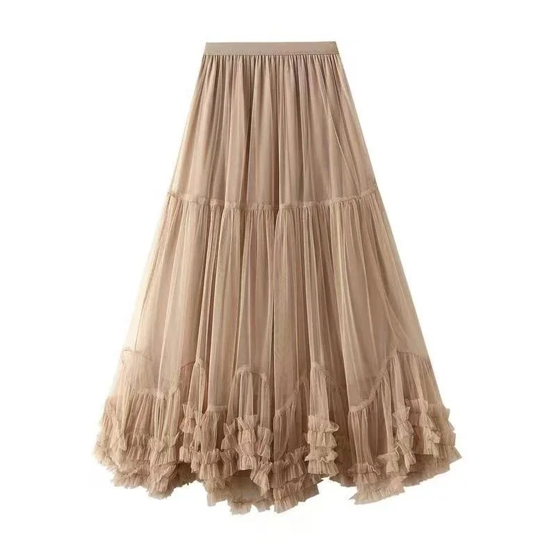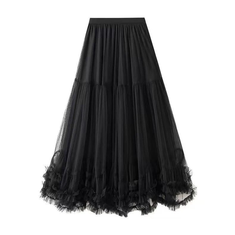 【超高.品.質】【裏地あり】ロングスカート 春服 ふんわりチュールスカート プリーツスカート ボリュームスカート ハイウエスト 細見えウエストゴム フレア/Aライン フリル ロングスカート