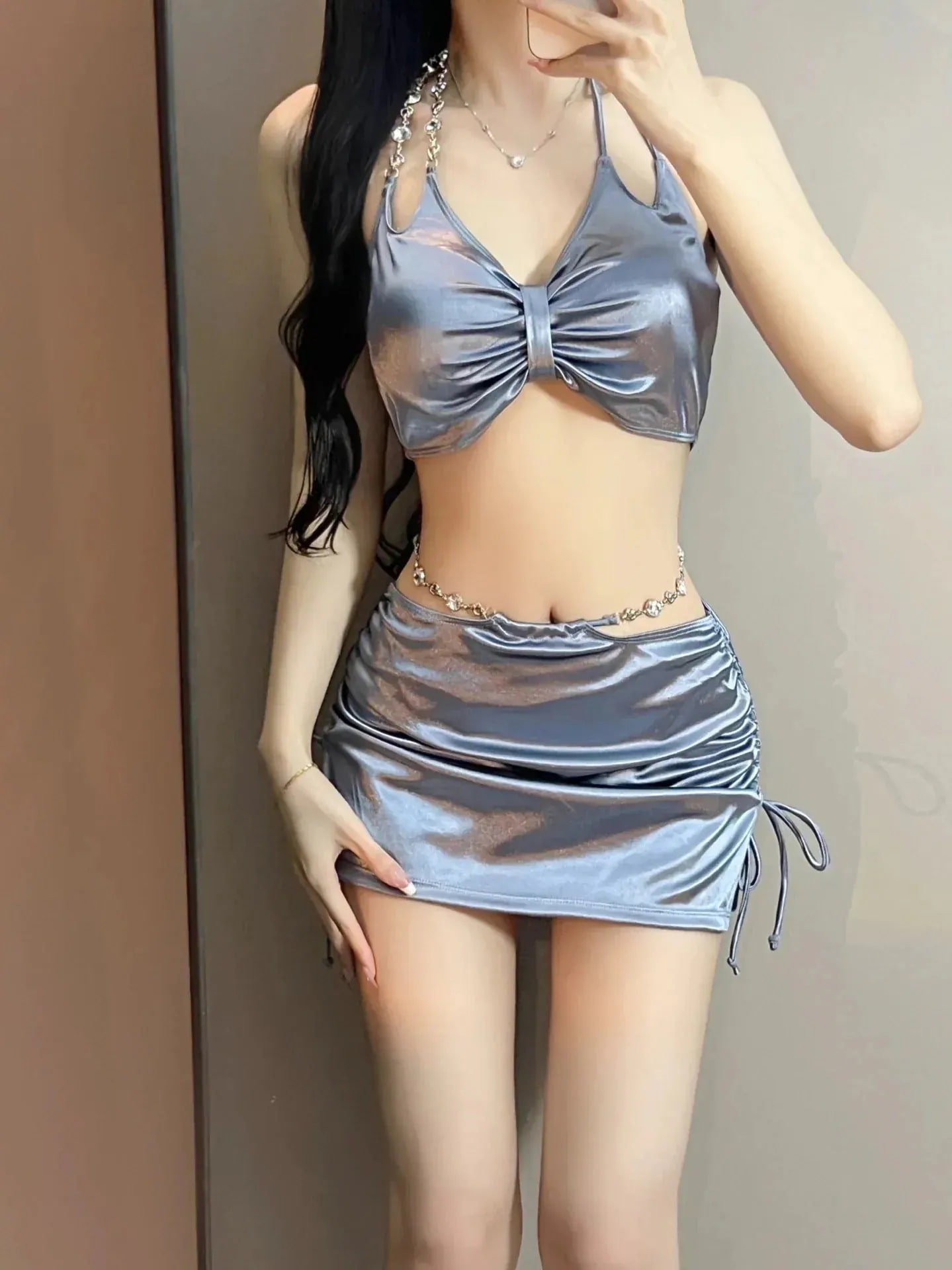 水着女性スリーピースセットはお腹を覆い薄く見えるセクシーなビキニハイエンドシルバーピュアデザイア風泡温泉水着休暇