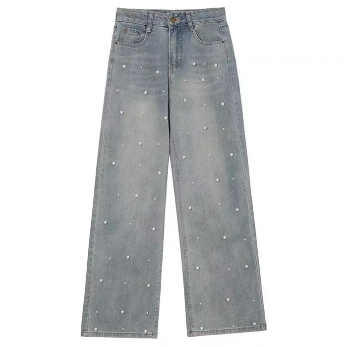 ジーンズ デニム レディース ストレートデニムワイドデニム ボーイフレンドデニム ゆったり大きいサイズ ホック ボーイズデニム カジュアル 韓国 体型カバー ハイウエスト ワイド 【パール付きデニム】
