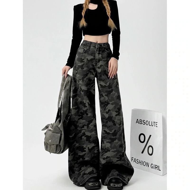2026春新作 デニムパンツレディース 迷彩柄 ロング丈ボトムスハイウエストジーンズ K-POPストリートファッション練習ジーンズ ゆったりレッグレディースカジュアル ワイドパンツ