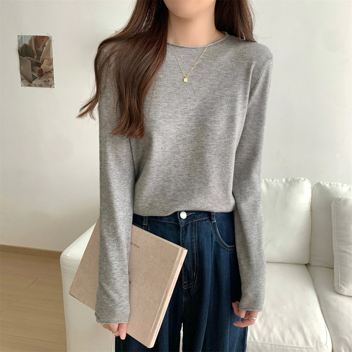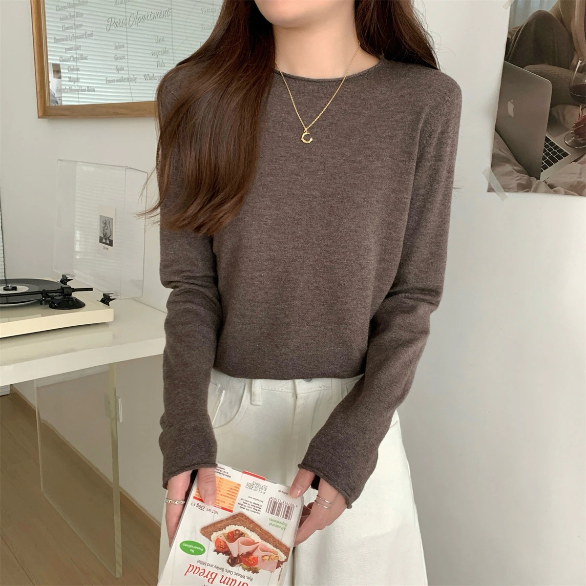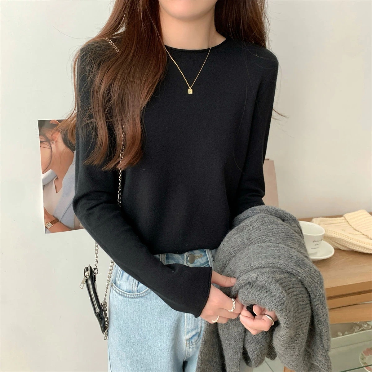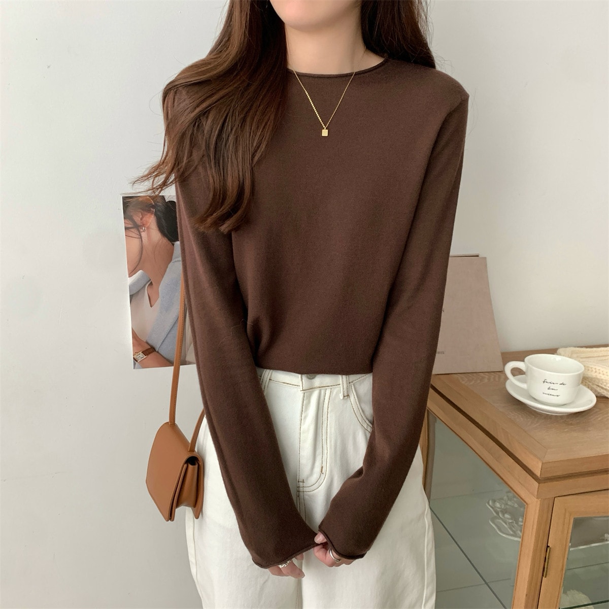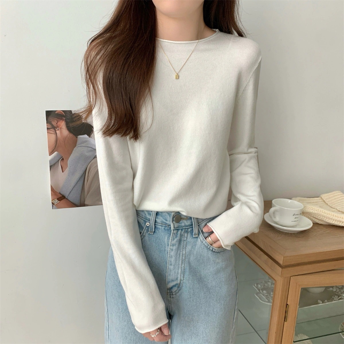 ニット レディース 長袖 秋 冬 メロー プチ セーター 無地 ハイネック ベーシック 柔らかい インナー フリル 無地 大人 シャツ 暖かい 着回し 薄手 重ね着