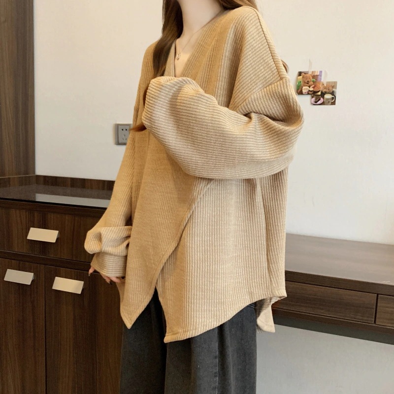 Tシャツ ストライプ レディース 長袖 ワッフル 上着 無地 韓国ファッション シンプル 部屋着 春 秋 冬 カットソー ベーシックニット ロンT