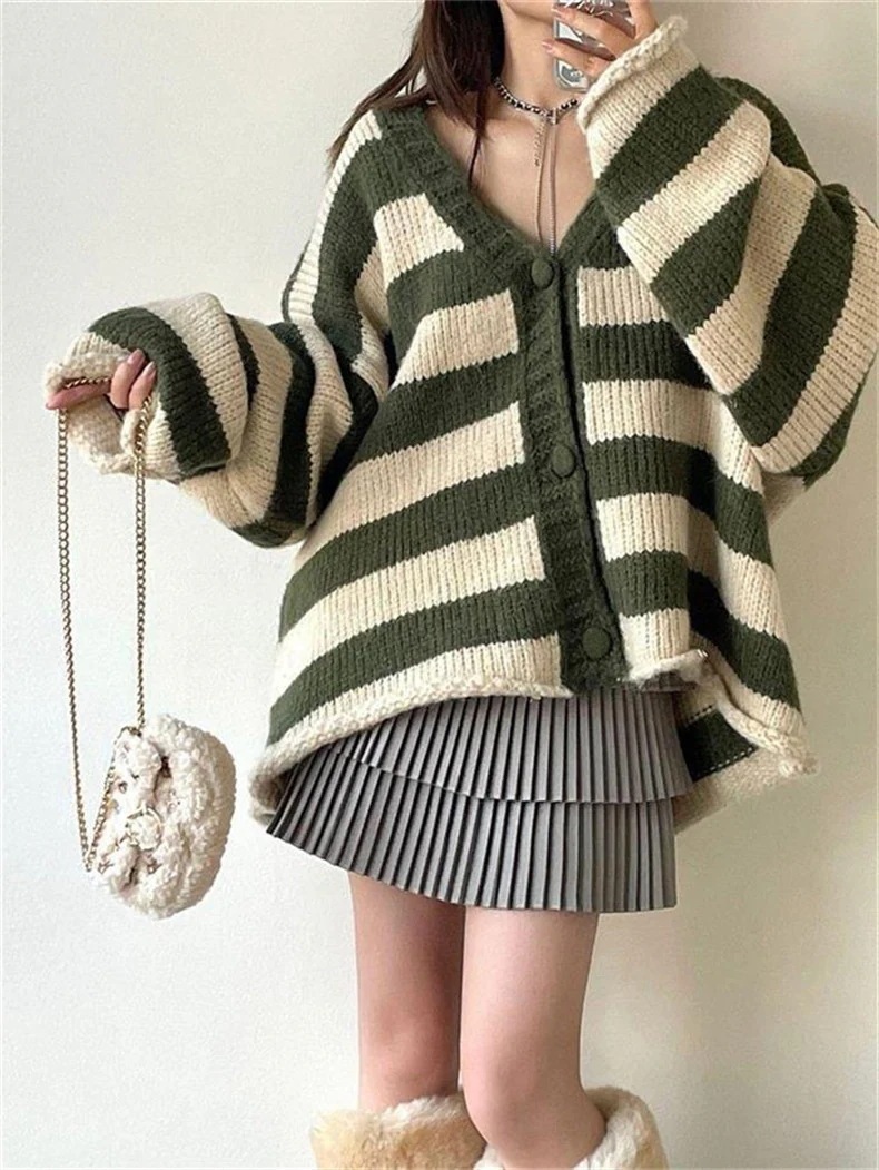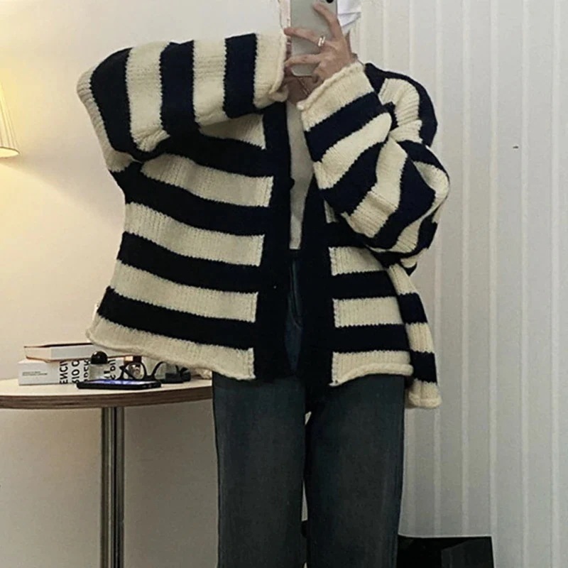 4色ニット カーディガン ストライプ レディース 秋冬 ミディアム 羽織 セーター 長袖 韓国ファッション カジュアル ゆったり ジャケット 可愛い 通勤 通学 着痩せ アウター コート ふんわり