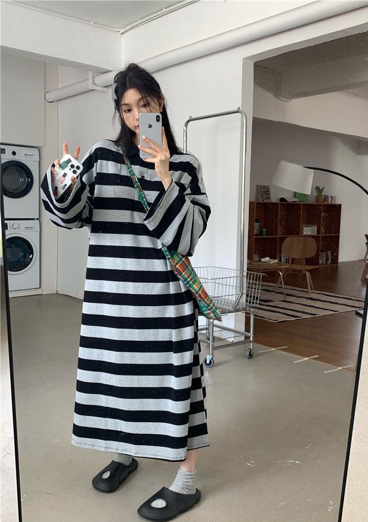 ストライプ ワンピース ロング丈 レディース 大きいサイズ ゆったり 秋冬 コーデ 無地 韓国ファッション polo 膝丈 ワンピース 長袖 体型カバー 着痩せ 通勤