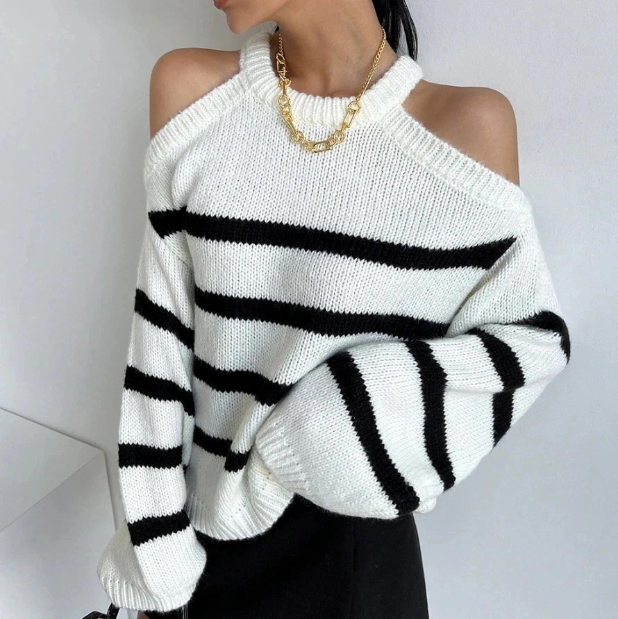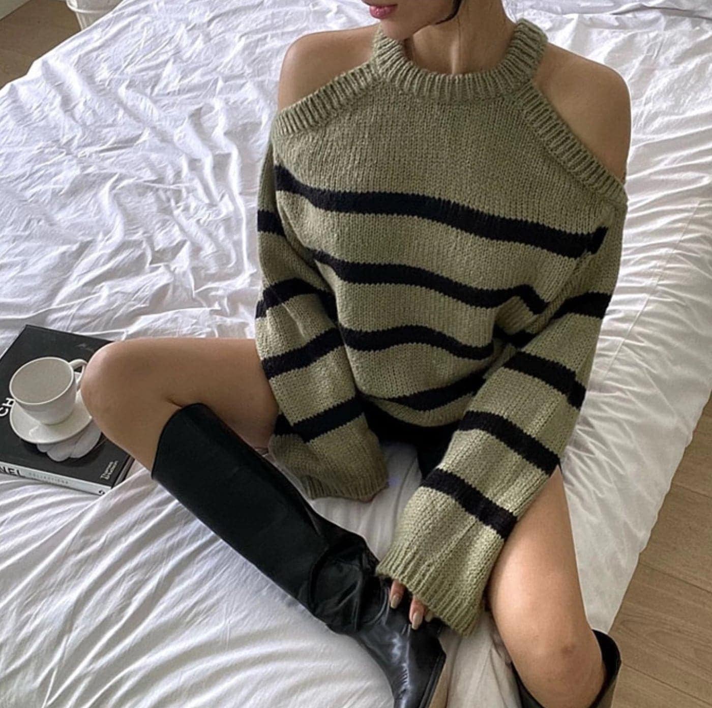 ニット レディース ラウンドネック 長袖 オープンショルダー ストライプ セーター カジュアル 日常着 長袖 トップス 秋服 着痩せ 韓国ファッション 怠惰な風