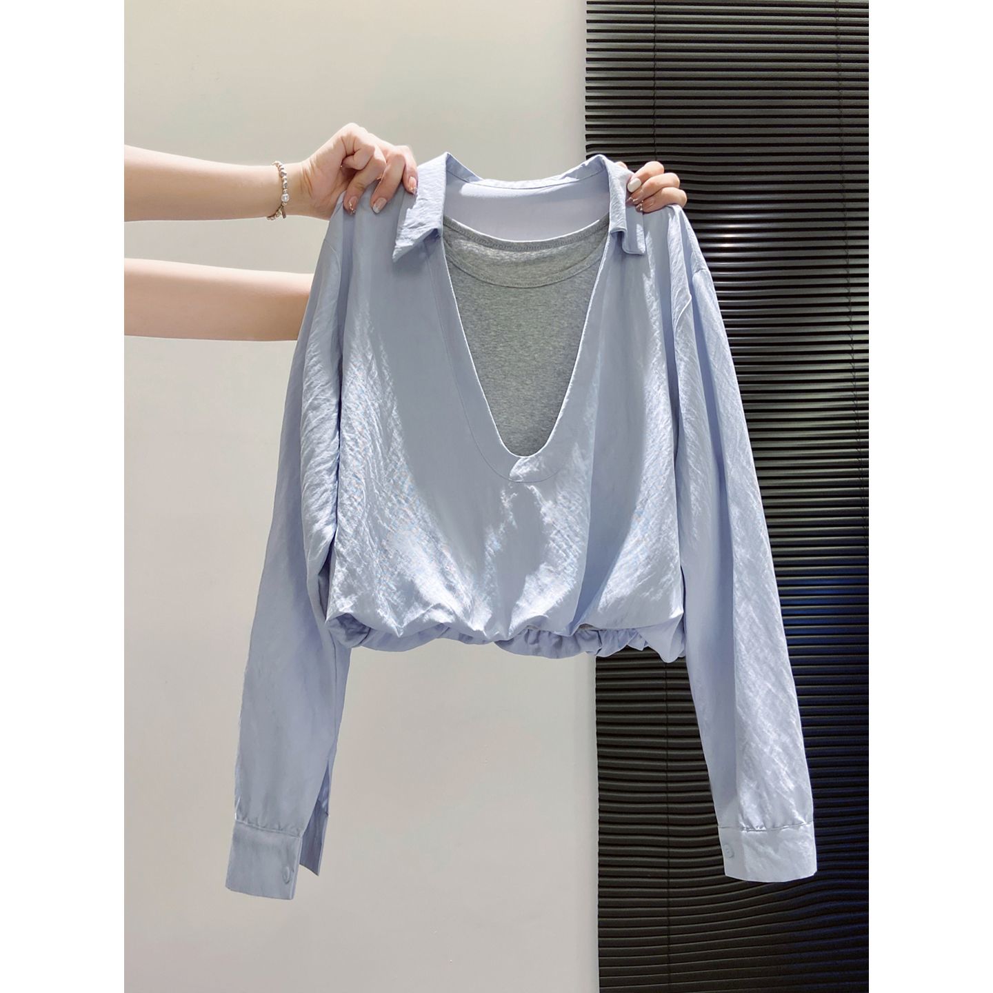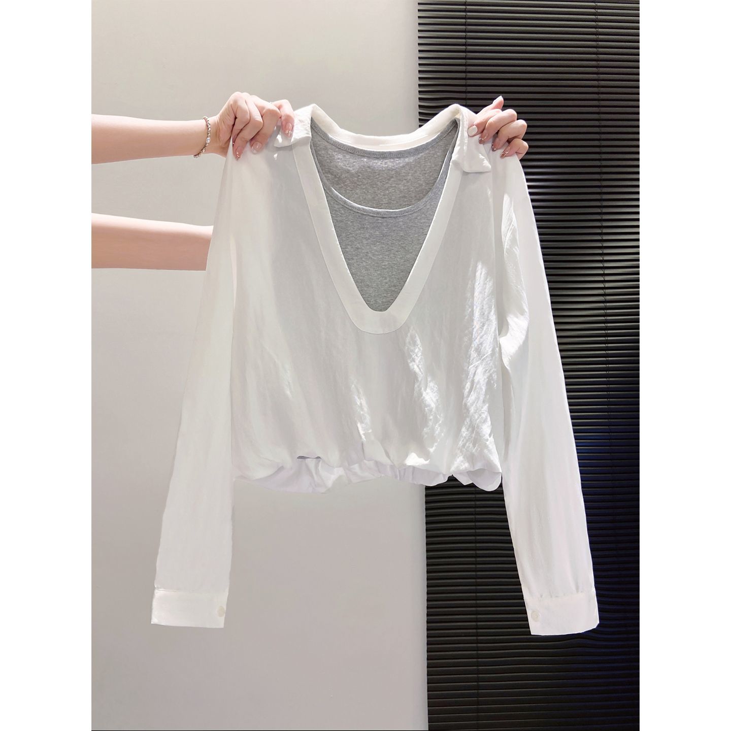 ブラウス 韓国風 切替 重ね着風 長袖シャツ レディース 秋新作 デザイン性 ゆったり 着痩せ エレガント