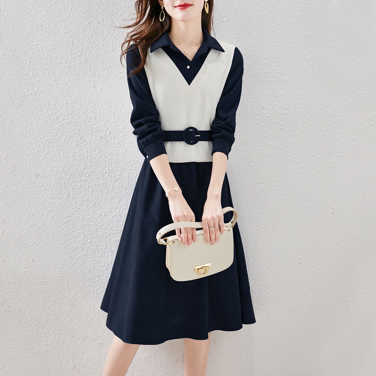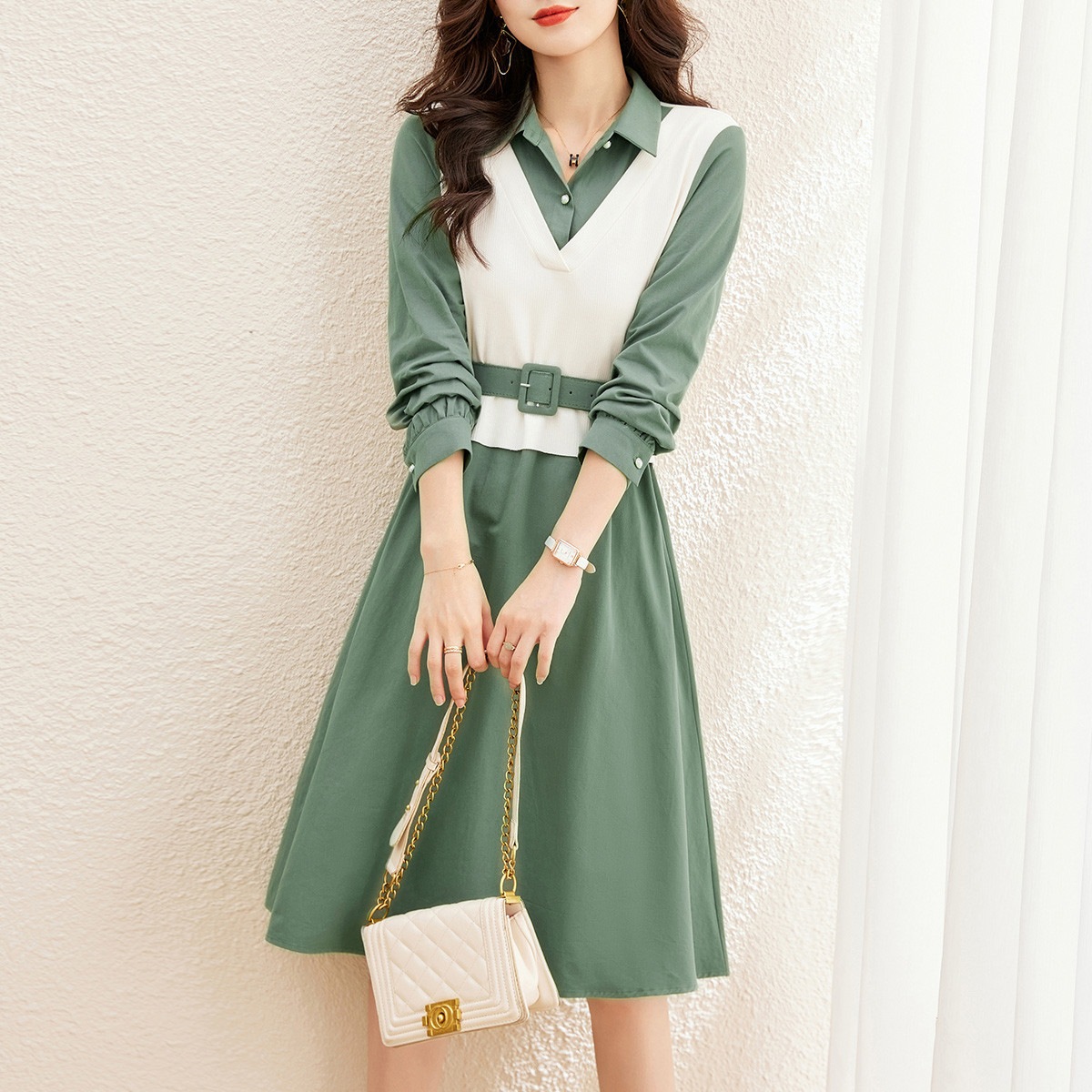 良品 シンプル おしゃれ ターンカラー Aライン スカート ベルト付き ウエストマーク 通勤 ワンピース レディース
