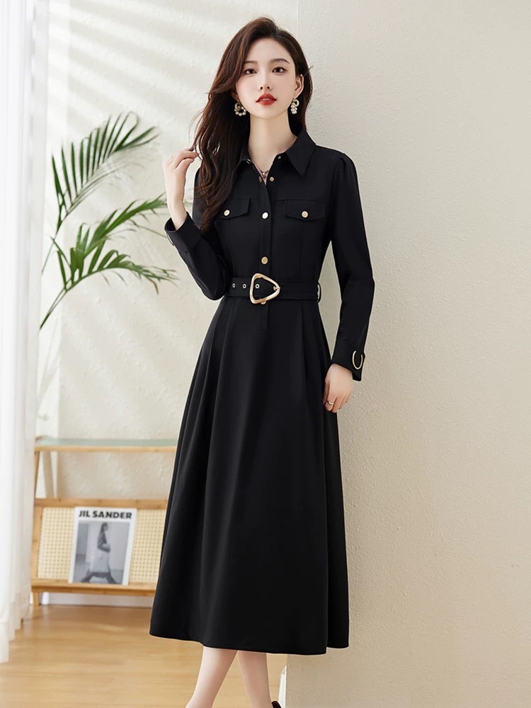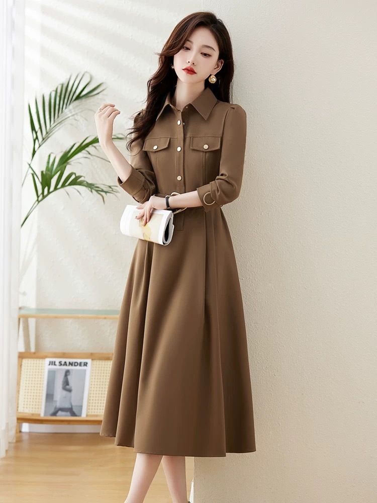 高級感 ロングスリーブ シャツ ワンピース レディース 2025 ウエストマーク スタイルアップ 上品 ターンカラー 膝丈 ロング丈 ワンピース