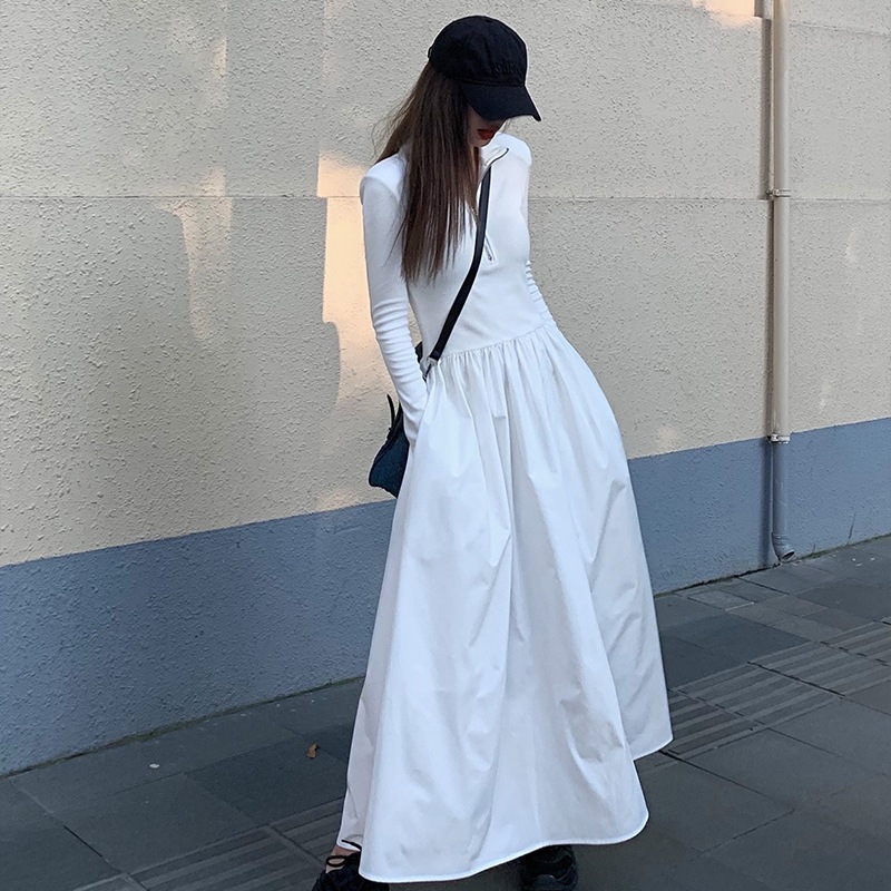 フレンチ ヘップバーン風 ハーフオープンカラー ジップ ワンピース レディース スタンドカラー ウエストマーク 体型カバー コートイン 大振りスカート