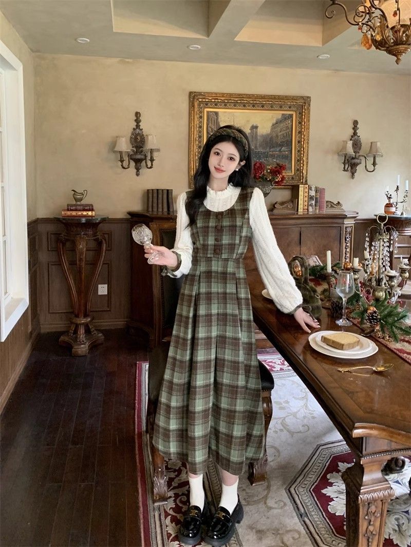 学院風 ツーピース風 グリーン ギンガムチェック ワンピース レディース 2025 小柄 コーデ ロング丈 ワンピース