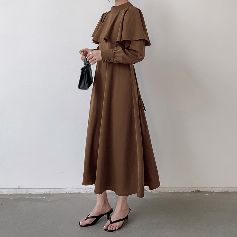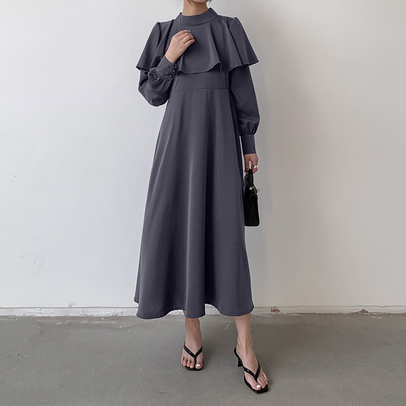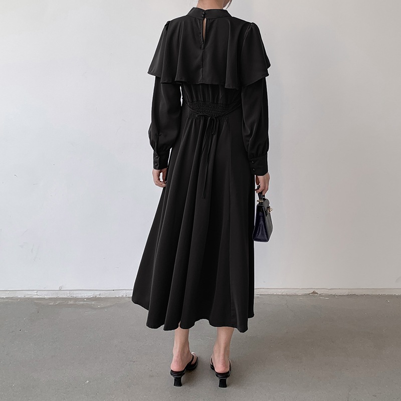 ファッション 2025 レディース 超ロング丈 ウエストマーク スタイルアップ OL ひだ襟 ロングスリーブ ワンピース