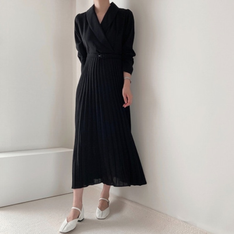 chic エレガント フレンチ ワンピース レディース ウエストマーク スタイルアップ 上品 大人可愛い プリーツ ロング丈 ワンピース